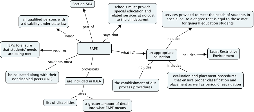 This Concept Map, created with IHMC CmapTools, has information related to: FAPELizBrown, FAPE part of Section 504, FAPE says that schools must provide special education and related services at no cost to the child/parent, an appropriate education includes services provided to meet the needs of students in special ed. to a degree that is equl to those met for general education students, FAPE students must be educated along with their nondisabled peers (LRE), FAPE who? all qualified persons with a disability under state law, FAPE requires IEP's to ensure that students' needs are being met, FAPE provisions are included in IDEA, are included in IDEA gives list of disabilities, FAPE what is? an appropriate education, an appropriate education includes Least Restrictive Environment, an appropriate education includes evaluation and placement procedures that ensure proper classification and placement as well as periodic reevaluation, are included in IDEA gives a greater amount of detail into what FAPE means, an appropriate education includes the establishment of due process procedures