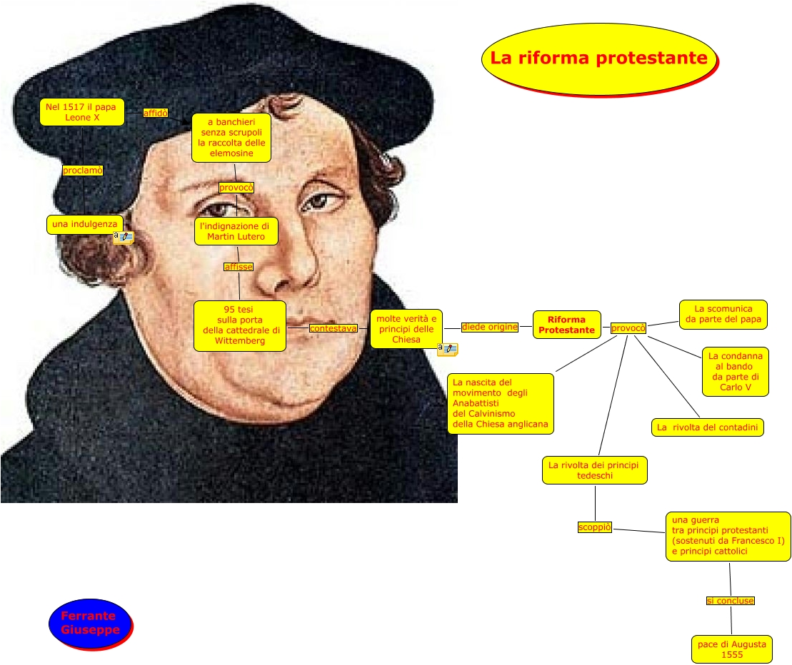 Questa Cmap, creata con IHMC CmapTools, contiene informazioni relative a: La Riforma protestante(FERRANTE), Riforma Protestante provocò La condanna al bando da parte di Carlo V, a banchieri senza scrupoli la raccolta delle elemosine provocò l'indignazione di Martin Lutero, molte verità e principi delle Chiesa diede origine Riforma Protestante, Riforma Protestante provocò La scomunica da parte del papa, Riforma Protestante provocò La rivolta del contadini, 95 tesi sulla porta della cattedrale di Wittemberg contestava molte verità e principi delle Chiesa, Nel 1517 il papa Leone X affidò a banchieri senza scrupoli la raccolta delle elemosine, La rivolta dei principi tedeschi scoppiò una guerra tra principi protestanti (sostenuti da Francesco I) e principi cattolici, una guerra tra principi protestanti (sostenuti da Francesco I) e principi cattolici si concluse pace di Augusta 1555, Riforma Protestante provocò La nascita del movimento degli Anabattisti del Calvinismo della Chiesa anglicana, Riforma Protestante provocò La rivolta dei principi tedeschi, l'indignazione di Martin Lutero affisse 95 tesi sulla porta della cattedrale di Wittemberg, Nel 1517 il papa Leone X proclamò una indulgenza
