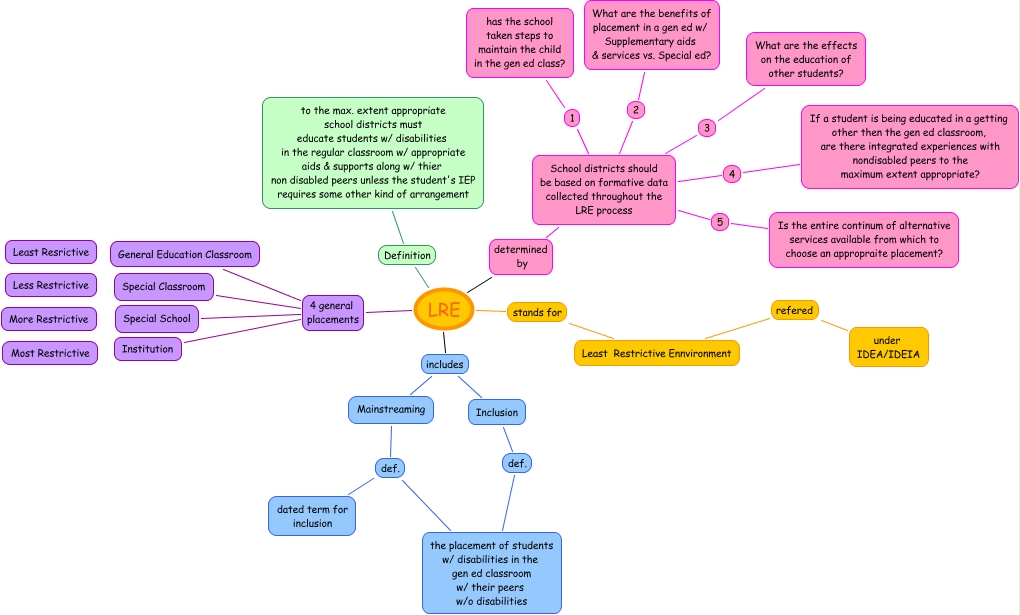 This Concept Map, created with IHMC CmapTools, has information related to: LRE, Inclusion def. the placement of students w/ disabilities in the gen ed classroom w/ their peers w/o disabilities, LRE Definition to the max. extent appropriate school districts must educate students w/ disabilities in the regular classroom w/ appropriate aids & supports along w/ thier non disabled peers unless the student's IEP requires some other kind of arrangement, School districts should be based on formative data collected throughout the LRE process 5 Is the entire continum of alternative services available from which to choose an appropraite placement?, Least Restrictive Ennvironment refered under IDEA/IDEIA, School districts should be based on formative data collected throughout the LRE process 4 If a student is being educated in a getting other then the gen ed classroom, are there integrated experiences with nondisabled peers to the maximum extent appropriate?, LRE stands for Least Restrictive Ennvironment, LRE 4 general placements Institution, LRE includes Inclusion, School districts should be based on formative data collected throughout the LRE process 2 What are the benefits of placement in a gen ed w/ Supplementary aids & services vs. Special ed?, LRE includes Mainstreaming, School districts should be based on formative data collected throughout the LRE process 3 What are the effects on the education of other students?, LRE determined by School districts should be based on formative data collected throughout the LRE process, School districts should be based on formative data collected throughout the LRE process 1 has the school taken steps to maintain the child in the gen ed class?, Mainstreaming def. the placement of students w/ disabilities in the gen ed classroom w/ their peers w/o disabilities, LRE 4 general placements Special Classroom, Mainstreaming def. dated term for inclusion, LRE 4 general placements General Education Classroom, LRE 4 general placements Special School