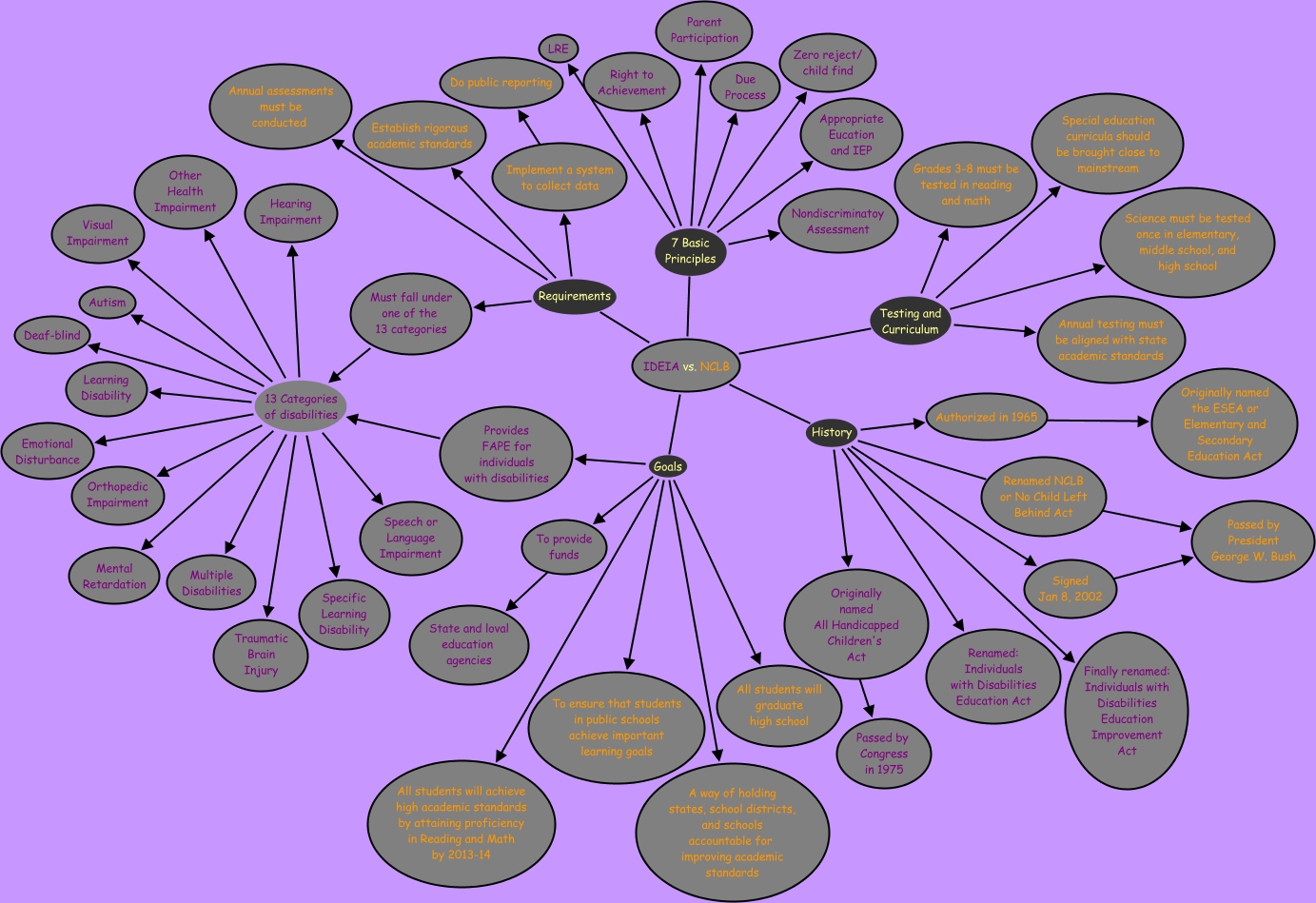 This Concept Map, created with IHMC CmapTools, has information related to: Amanda Lee IDEIA vs. NCLB, IDEIA vs. NCLB Requirements Establish rigorous academic standards, Provides FAPE for individuals with disabilities 13 Categories of disabilities Mental Retardation, Must fall under one of the 13 categories 13 Categories of disabilities Traumatic Brain Injury, Must fall under one of the 13 categories 13 Categories of disabilities Mental Retardation, IDEIA vs. NCLB Goals To provide funds, IDEIA vs. NCLB Requirements Must fall under one of the 13 categories, IDEIA vs. NCLB Goals All students will achieve high academic standards by attaining proficiency in Reading and Math by 2013-14, Provides FAPE for individuals with disabilities 13 Categories of disabilities Other Health Impairment, Must fall under one of the 13 categories 13 Categories of disabilities Multiple Disabilities, IDEIA vs. NCLB 7 Basic Principles Appropriate Eucation and IEP, IDEIA vs. NCLB Requirements Annual assessments must be conducted, Must fall under one of the 13 categories 13 Categories of disabilities Learning Disability, Must fall under one of the 13 categories 13 Categories of disabilities Other Health Impairment, IDEIA vs. NCLB Goals All students will graduate high school, Provides FAPE for individuals with disabilities 13 Categories of disabilities Specific Learning Disability, IDEIA vs. NCLB 7 Basic Principles Due Process, Provides FAPE for individuals with disabilities 13 Categories of disabilities Learning Disability, Must fall under one of the 13 categories 13 Categories of disabilities Visual Impairment, Must fall under one of the 13 categories 13 Categories of disabilities Deaf-blind, IDEIA vs. NCLB Goals Provides FAPE for individuals with disabilities