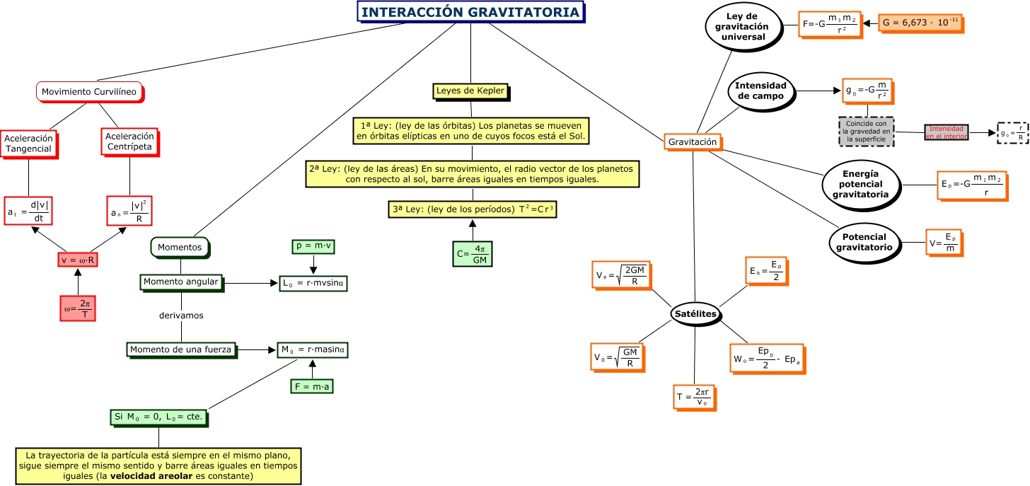 Aquest mapa conceptual conté informació relacionada amb: Interacción Gravitatoria Dani, Momentos Momento angular, Gravitación Energía potencial gravitatoria <math xmlns="http://www.w3.org/1998/Math/MathML"> <mrow> <mmultiscripts> <mtext> E </mtext> <mtext> p </mtext> <none/> </mmultiscripts> <mtext> =-G </mtext> <mfrac> <mrow> <mmultiscripts> <mtext> m </mtext> <mtext> 1 </mtext> <none/> </mmultiscripts> <mmultiscripts> <mtext> m </mtext> <mtext> 2 </mtext> <none/> </mmultiscripts> </mrow> <mmultiscripts> <mtext> r </mtext> <none/> <mtext> </mtext> </mmultiscripts> </mfrac> </mrow> </math>, <math xmlns="http://www.w3.org/1998/Math/MathML"> <mrow> <mtext> ω= </mtext> <mfrac> <mtext> 2π </mtext> <mtext> T </mtext> </mfrac> </mrow> </math> v = ω·R, Gravitación Intensidad de campo <math xmlns="http://www.w3.org/1998/Math/MathML"> <mrow> <mmultiscripts> <mtext> g </mtext> <mtext> 0 </mtext> <none/> </mmultiscripts> <mtext> =-G </mtext> <mfrac> <mtext> m </mtext> <mmultiscripts> <mtext> r </mtext> <none/> <mtext> 2 </mtext> </mmultiscripts> </mfrac> </mrow> </math>, Aceleración Tangencial <math xmlns="http://www.w3.org/1998/Math/MathML"> <mmultiscripts> <mtext> a </mtext> <mtext> t </mtext> <none/> </mmultiscripts> <mtext> = </mtext> <mfrac> <mrow> <mtext> d </mtext> <mfenced open="|" close="|"> <mtext> v </mtext> </mfenced> </mrow> <mtext> dt </mtext> </mfrac> </math>, <math xmlns="http://www.w3.org/1998/Math/MathML"> <mrow> <mtext> C= </mtext> <mfrac> <mtext> 4π </mtext> <mtext> GM </mtext> </mfrac> </mrow> </math> <math xmlns="http://www.w3.org/1998/Math/MathML"> <mrow> <mtext> 3ª Ley: (ley de los períodos) </mtext> <mmultiscripts> <mtext> T </mtext> <none/> <mtext> 2 </mtext> </mmultiscripts> <mtext> =C </mtext> <mmultiscripts> <mtext> r </mtext> <none/> <mtext> 3 </mtext> </mmultiscripts> </mrow> </math>, Momento de una fuerza <math xmlns="http://www.w3.org/1998/Math/MathML"> <mrow> <mmultiscripts> <mtext> M </mtext> <mtext> 0 </mtext> <none/> </mmultiscripts> <mtext> = r·masinα </mtext> </mrow> </math>, INTERACCIÓN GRAVITATORIA Leyes de Kepler, Movimiento Curvilíneo Aceleración Centrípeta, INTERACCIÓN GRAVITATORIA Movimiento Curvilíneo, Gravitación Satélites <math xmlns="http://www.w3.org/1998/Math/MathML"> <mrow> <mmultiscripts> <mtext> E </mtext> <mtext> o </mtext> <none/> </mmultiscripts> <mtext> = </mtext> <mfrac> <mmultiscripts> <mtext> E </mtext> <mtext> p </mtext> <none/> </mmultiscripts> <mtext> 2 </mtext> </mfrac> </mrow> </math>, <math xmlns="http://www.w3.org/1998/Math/MathML"> <mrow> <mtext> Si </mtext> <mmultiscripts> <mtext> M </mtext> <mtext> 0 </mtext> <none/> </mmultiscripts> <mtext> = 0, </mtext> <mmultiscripts> <mtext> L </mtext> <mtext> 0 </mtext> <none/> </mmultiscripts> <mtext> = cte. </mtext> </mrow> </math> La trayectoria de la partícula está siempre en el mismo plano, sigue siempre el mismo sentido y barre áreas iguales en tiempos iguales (la velocidad areolar es constante), INTERACCIÓN GRAVITATORIA Gravitación, Aceleración Centrípeta <math xmlns="http://www.w3.org/1998/Math/MathML"> <mmultiscripts> <mtext> a </mtext> <mtext> n </mtext> <none/> </mmultiscripts> <mtext> = </mtext> <mfrac> <mmultiscripts> <mfenced open="|" close="|"> <mtext> v </mtext> </mfenced> <none/> <mtext> 2 </mtext> </mmultiscripts> <mtext> R </mtext> </mfrac> </math>, v = ω·R <math xmlns="http://www.w3.org/1998/Math/MathML"> <mmultiscripts> <mtext> a </mtext> <mtext> t </mtext> <none/> </mmultiscripts> <mtext> = </mtext> <mfrac> <mrow> <mtext> d </mtext> <mfenced open="|" close="|"> <mtext> v </mtext> </mfenced> </mrow> <mtext> dt </mtext> </mfrac> </math>, Momento angular derivamos Momento de una fuerza, <math xmlns="http://www.w3.org/1998/Math/MathML"> <mtext> 2ª Ley: (ley de las áreas) En su movimiento, el radio vector de los planetos