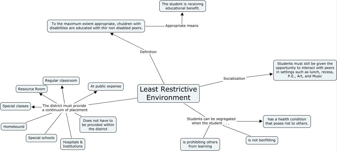 This Concept Map, created with IHMC CmapTools, has information related to: LRE, Least Restrictive Environment The district must provide a continuum of placement At public expense, Least Restrictive Environment Students can be segregated when the student . . . is prohibiting others from learning, Least Restrictive Environment The district must provide a continuum of placement Hospitals & Institutions, To the maximum extent appropriate, chuldren with disabilities are educated with thir non disabled peers. Appropriate means The student is receiving educational benefit., Least Restrictive Environment The district must provide a continuum of placement Regular classroom, Least Restrictive Environment The district must provide a continuum of placement Resource Room, Least Restrictive Environment The district must provide a continuum of placement Homebound, Least Restrictive Environment Students can be segregated when the student . . . has a health condition that poses rist to others., Least Restrictive Environment The district must provide a continuum of placement Does not have to be provided within the district, Least Restrictive Environment The district must provide a continuum of placement Special schools, Least Restrictive Environment Socialization Students must still be given the opportunity to interact with peers in settings such as lunch, recess, P.E., Art, and Music, Least Restrictive Environment Students can be segregated when the student . . . is not benfitting, Least Restrictive Environment The district must provide a continuum of placement Special classes, Least Restrictive Environment Definition To the maximum extent appropriate, chuldren with disabilities are educated with thir non disabled peers.