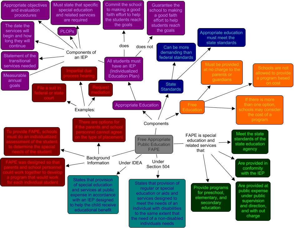 This Concept Map, created with IHMC CmapTools, has information related to: Amanda Lee FAPE, All students must have an IEP (Individualized Education Plan) Components of an IEP Appropriate objectives and evaluation procedures, Free Appropriate Public Education FAPE FAPE is special education and related services that: Meet the state standards of the state education agency, Free Appropriate Public Education FAPE Background Information To provide FAPE, schools must do an individualized assessment of the student to determine the special needs of the student, All students must have an IEP (Individualized Education Plan) Components of an IEP Must state that specific special education and related services are required, Appropriate Education ???? All students must have an IEP (Individualized Education Plan), Free Appropriate Public Education FAPE FAPE is special education and related services that: Are provided at public expense under public supervision and direction, and with out charge, All students must have an IEP (Individualized Education Plan) does Commit the school to making a good faith effort to help the students reach the goals, Free Appropriate Public Education FAPE FAPE is special education and related services that: Provide programs for preschool, elementary, and secondary education, Free Appropriate Public Education FAPE Under Section 504 States that provision of regular or special education or aids and services designed to meet the needs of an individual with disabilities to the same extent that the need of a non-disabled individuals needs, All students must have an IEP (Individualized Education Plan) Components of an IEP PLOPs, State Standards ???? Appropriate education must meet the state standards, There are options for if the parents and school personnel cannot agree on the type of placement Examples: Request mediation, Free Appropriate Public Education FAPE Components State Standards, Free Appropriate Public Education FAPE Components Free Education, Free Appropriate Public Education FAPE Under IDEA States that provision of special education and services at public expense in accordance with an IEP designed to help the child receive educational benefit, All students must have an IEP (Individualized Education Plan) does not Guarantee the school to making a good faith effort to help students reach the goals, Free Education ???? If there is more than one option, schools may consider the cost of a program, Free Appropriate Public Education FAPE FAPE is special education and related services that: Are provided in conformity with the IEP, All students must have an IEP (Individualized Education Plan) Components of an IEP Measurable annual goals, Free Education ???? Must be provided at no charge to the parents or guardians