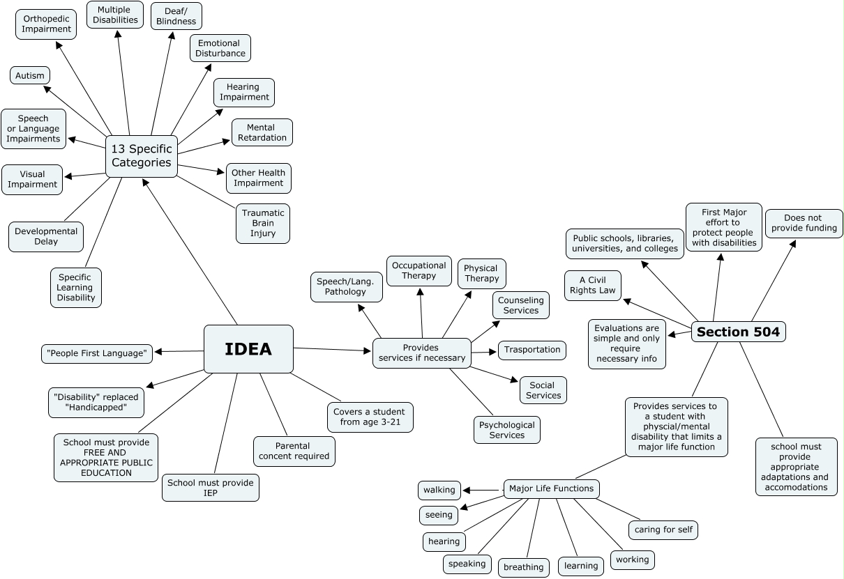 This Concept Map, created with IHMC CmapTools, has information related to: IDEA and 504, Section 504 ???? First Major effort to protect people with disabilities, 13 Specific Categories ???? Multiple Disabilities, Provides services if necessary ???? Trasportation, 13 Specific Categories ???? Orthopedic Impairment, Provides services to a student with physcial/mental disability that limits a major life function Major Life Functions, Major Life Functions ???? seeing, IDEA ???? Provides services if necessary, Section 504 ???? Provides services to a student with physcial/mental disability that limits a major life function, Major Life Functions ???? speaking, Provides services if necessary ???? Psychological Services, Section 504 ???? Does not provide funding, 13 Specific Categories ???? Emotional Disturbance, IDEA ???? Covers a student from age 3-21, IDEA ???? "Disability" replaced "Handicapped", Major Life Functions ???? learning, Major Life Functions ???? breathing, Provides services if necessary ???? Social Services, Major Life Functions ???? working, 13 Specific Categories ???? Other Health Impairment, 13 Specific Categories ???? Speech or Language Impairments