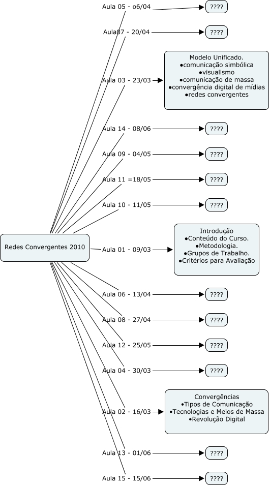 Esse mapa conceitual, produzido no IHMC CmapTools, tem a informação relacionada a: Redes convergentes 2010, Redes Convergentes 2010 Aula 01 - 09/03 Introdução ● Conteúdo do Curso. ● Metodologia. ● Grupos de Trabalho. ● Critérios para Avaliação, Redes Convergentes 2010 Aula07 - 20/04 ????, Redes Convergentes 2010 Aula 06 - 13/04 ????, Redes Convergentes 2010 Aula 09 - 04/05 ????, Redes Convergentes 2010 Aula 13 - 01/06 ????, Redes Convergentes 2010 Aula 05 - o6/04 ????, Redes Convergentes 2010 Aula 14 - 08/06 ????, Redes Convergentes 2010 Aula 11 =18/05 ????, Redes Convergentes 2010 Aula 08 - 27/04 ????, Redes Convergentes 2010 Aula 12 - 25/05 ????, Redes Convergentes 2010 Aula 02 - 16/03 Convergências • Tipos de Comunicação • Tecnologias e Meios de Massa • Revolução Digital, Redes Convergentes 2010 Aula 04 - 30/03 ????, Redes Convergentes 2010 Aula 15 - 15/06 ????, Redes Convergentes 2010 Aula 10 - 11/05 ????, Redes Convergentes 2010 Aula 03 - 23/03 Modelo Unificado. ● comunicação simbólica ● visualismo ● comunicação de massa ● convergência digital de mídias ● redes convergentes