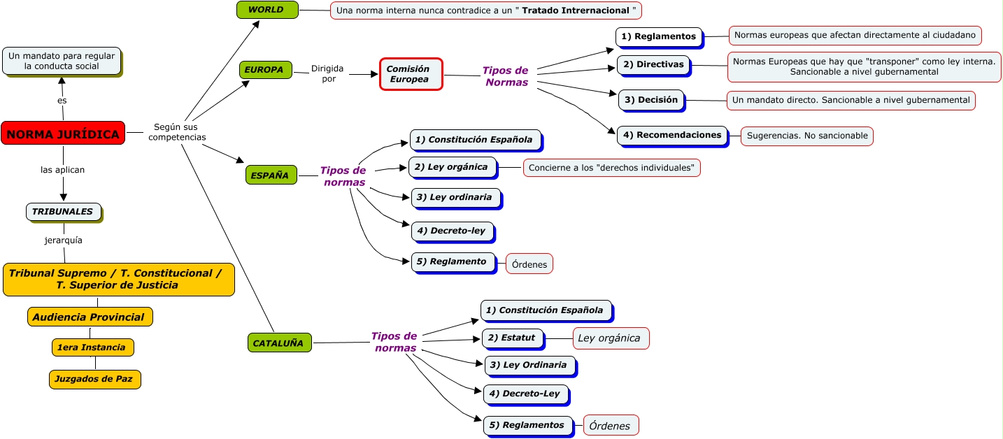 Este Cmap, tiene información relacionada con: Cmap1, CATALUÑA Tipos de normas 1) Constitución Española, EUROPA Dirigida por Comisión Europea, Audiencia Provincial ???? 1era Instancia, TRIBUNALES jerarquía Tribunal Supremo / T. Constitucional / T. Superior de Justicia, CATALUÑA Tipos de normas 2) Estatut, ESPAÑA Tipos de normas 3) Ley ordinaria, NORMA JURÍDICA Según sus competencias WORLD, NORMA JURÍDICA es Un mandato para regular la conducta social, 2) Directivas ???? Normas Europeas que hay que "transponer" como ley interna. Sancionable a nivel gubernamental, CATALUÑA Tipos de normas 4) Decreto-Ley, NORMA JURÍDICA las aplican TRIBUNALES, Juzgados de Paz ???? 1era Instancia, 3) Decisión ???? Un mandato directo. Sancionable a nivel gubernamental, Tribunal Supremo / T. Constitucional / T. Superior de Justicia ???? Audiencia Provincial, 2) Estatut ???? Ley orgánica, 5) Reglamento ???? Órdenes, 1) Reglamentos ???? Normas europeas que afectan directamente al ciudadano, NORMA JURÍDICA Según sus competencias EUROPA, Comisión Europea Tipos de Normas 2) Directivas, 5) Reglamentos ???? Órdenes