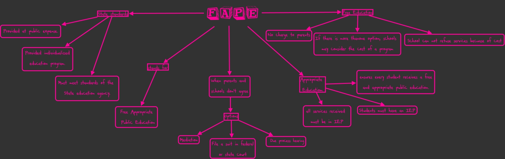 This Concept Map, created with IHMC CmapTools, has information related to: FAPE, FAPE State standards Must meet standards of the State education agency., FAPE Free Education School can not refuse services becuase of cost, FAPE Appropriate Educatiom all services received must be in IEP, FAPE Free Education No charge to parents, FAPE State standards Provided individualized education program., When parents and schools don't agree Options Due process hearing, FAPE ???? When parents and schools don't agree, FAPE Appropriate Educatiom Students must have an IEP, FAPE Appropriate Educatiom ensures every student receives a free and appropriate public education., When parents and schools don't agree Options File a suit in federal or state court, FAPE Free Education If there is more thanone option, schools may consider the cost of a program, When parents and schools don't agree Options Mediation, FAPE State standards Provided at public expense., FAPE stands for Free Appropriate Public Education