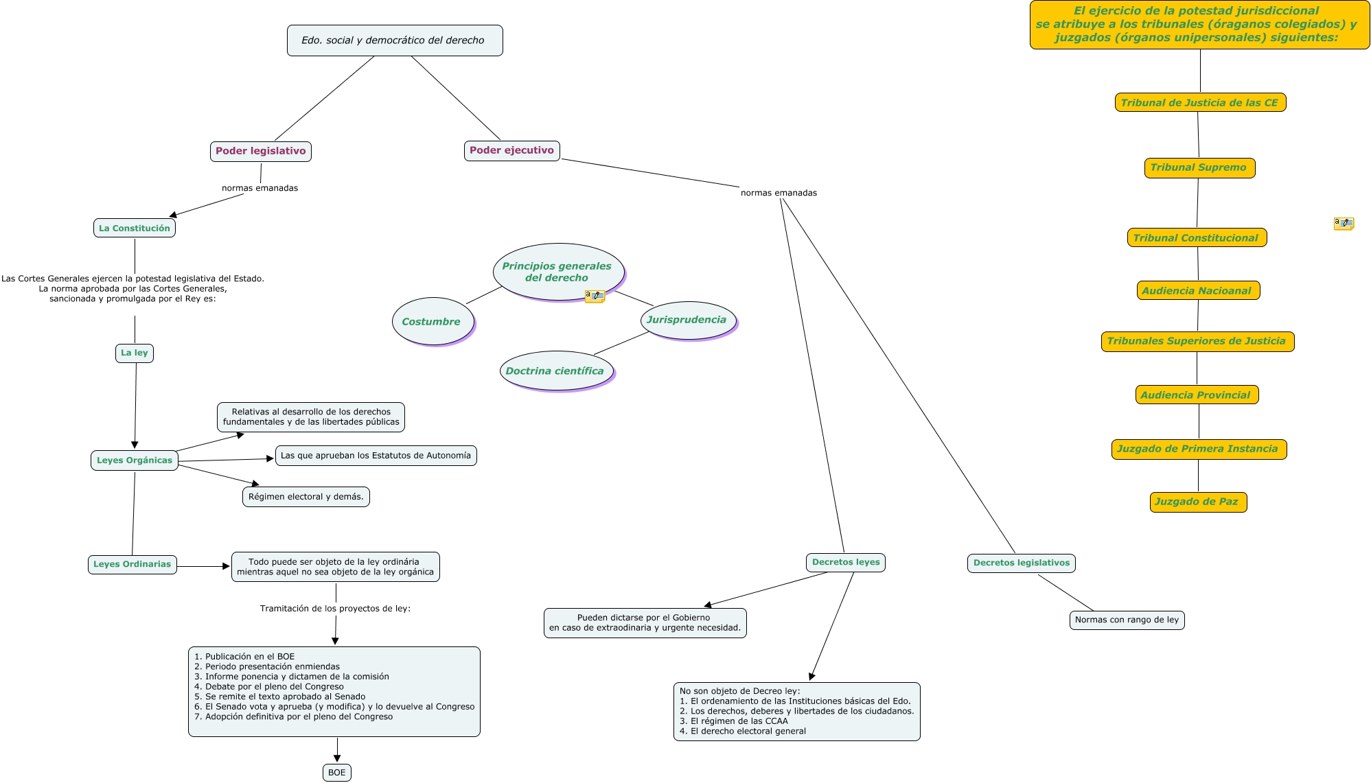 Aquest mapa conceptual conté informació relacionada amb: Jerarquía, Decretos legislativos ???? Normas con rango de ley, Edo. social y democrático del derecho ???? Poder ejecutivo, Leyes Orgánicas ???? Leyes Ordinarias, Tribunales Superiores de Justicia ???? Audiencia Provincial, Juzgado de Primera Instancia ???? Juzgado de Paz, Decretos leyes ???? No son objeto de Decreo ley: 1. El ordenamiento de las Instituciones básicas del Edo. 2. Los derechos, deberes y libertades de los ciudadanos. 3. El régimen de las CCAA 4. El derecho electoral general, 1. Publicación en el BOE 2. Periodo presentación enmiendas 3. Informe ponencia y dictamen de la comisión 4. Debate por el pleno del Congreso 5. Se remite el texto aprobado al Senado 6. El Senado vota y aprueba (y modifica) y lo devuelve al Congreso 7. Adopción definitiva por el pleno del Congreso ???? BOE, Leyes Orgánicas ???? Las que aprueban los Estatutos de Autonomía, Jurisprudencia ???? Doctrina científica, Leyes Orgánicas ???? Régimen electoral y demás., Edo. social y democrático del derecho Poder legislativo, Todo puede ser objeto de la ley ordinária mientras aquel no sea objeto de la ley orgánica Tramitación de los proyectos de ley: 1. Publicación en el BOE 2. Periodo presentación enmiendas 3. Informe ponencia y dictamen de la comisión 4. Debate por el pleno del Congreso 5. Se remite el texto aprobado al Senado 6. El Senado vota y aprueba (y modifica) y lo devuelve al Congreso 7. Adopción definitiva por el pleno del Congreso, Poder legislativo normas emanadas La Constitución, Principios generales del derecho ???? Jurisprudencia, El ejercicio de la potestad jurisdiccional se atribuye a los tribunales (óraganos colegiados) y juzgados (órganos unipersonales) siguientes: ???? Tribunal de Justicia de las CE, Tribunal Constitucional ???? Audiencia Nacioanal, La ley ???? Leyes Orgánicas, Audiencia Provincial ???? Juzgado de Primera Instancia, Decretos leyes ???? Pueden dictarse por el Gobierno en caso de extraodinaria y urgente necesidad., La Constitución Las Cortes Generales ejercen la potestad legislativa del Estado. La norma aprobada por las Cortes Generales, sancionada y promulgada por el Rey es: La ley