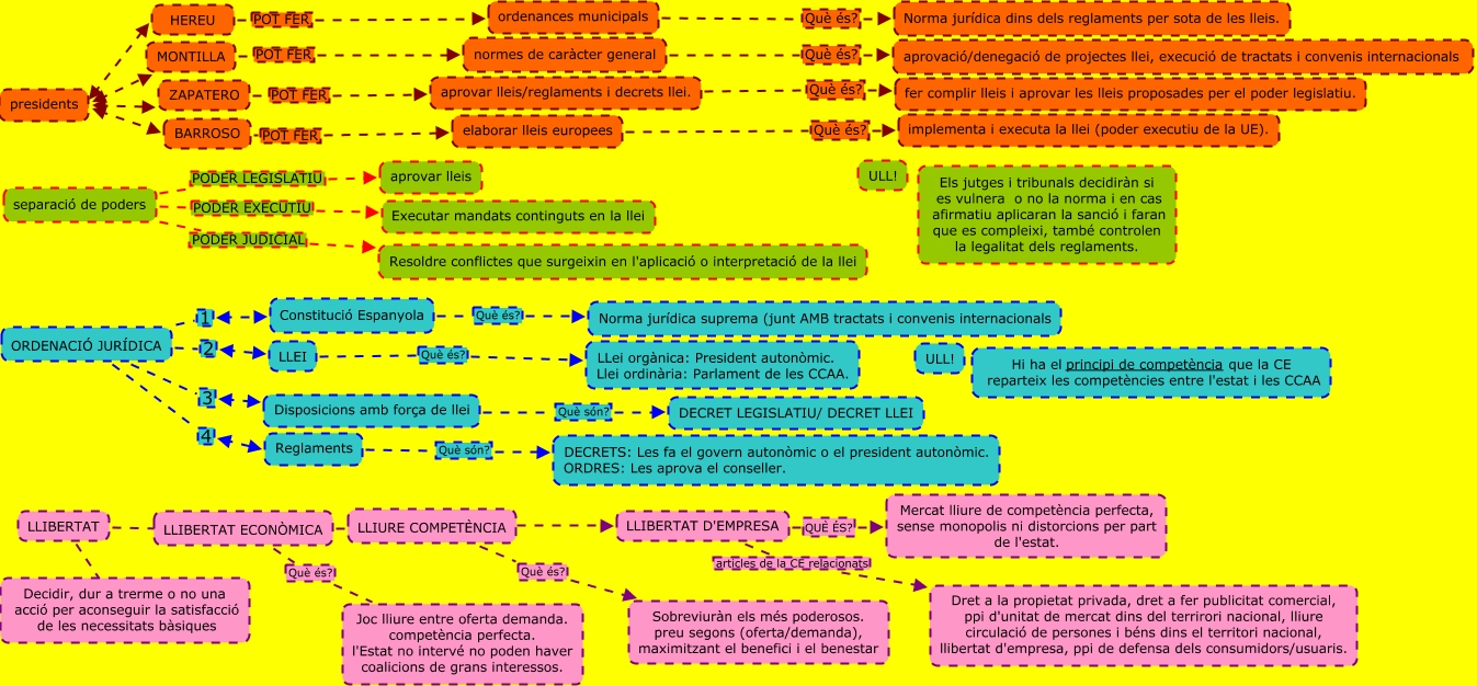 Aquest mapa conceptual conté informació relacionada amb: PRACTICA 1_Legal tools, LLIBERTAT ???? LLIBERTAT ECONÒMICA, separació de poders PODER JUDICIAL Resoldre conflictes que surgeixin en l'aplicació o interpretació de la llei, LLIBERTAT D'EMPRESA articles de la CE relacionats Dret a la propietat privada, dret a fer publicitat comercial, ppi d'unitat de mercat dins del terrirori nacional, lliure circulació de persones i béns dins el territori nacional, llibertat d'empresa, ppi de defensa dels consumidors/usuaris., presidents . HEREU, separació de poders PODER LEGISLATIU aprovar lleis, ORDENACIÓ JURÍDICA 3 Disposicions amb força de llei, LLIBERTAT ???? Decidir, dur a trerme o no una acció per aconseguir la satisfacció de les necessitats bàsiques, separació de poders PODER EXECUTIU Executar mandats continguts en la llei, ordenances municipals Què és? Norma jurídica dins dels reglaments per sota de les lleis., LLEI Què és? LLei orgànica: President autonòmic. Llei ordinària: Parlament de les CCAA., elaborar lleis europees Què és? implementa i executa la llei (poder executiu de la UE)., ORDENACIÓ JURÍDICA 2 LLEI, Reglaments Què són? DECRETS: Les fa el govern autonòmic o el president autonòmic. ORDRES: Les aprova el conseller., Constitució Espanyola Què és? Norma jurídica suprema (junt AMB tractats i convenis internacionals, LLIBERTAT ECONÒMICA ???? LLIURE COMPETÈNCIA, Disposicions amb força de llei Què són? DECRET LEGISLATIU/ DECRET LLEI, LLIBERTAT D'EMPRESA QUÈ ÉS? Mercat lliure de competència perfecta, sense monopolis ni distorcions per part de l'estat., presidents . MONTILLA, normes de caràcter general Què és? aprovació/denegació de projectes llei, execució de tractats i convenis internacionals, HEREU POT FER ordenances municipals
