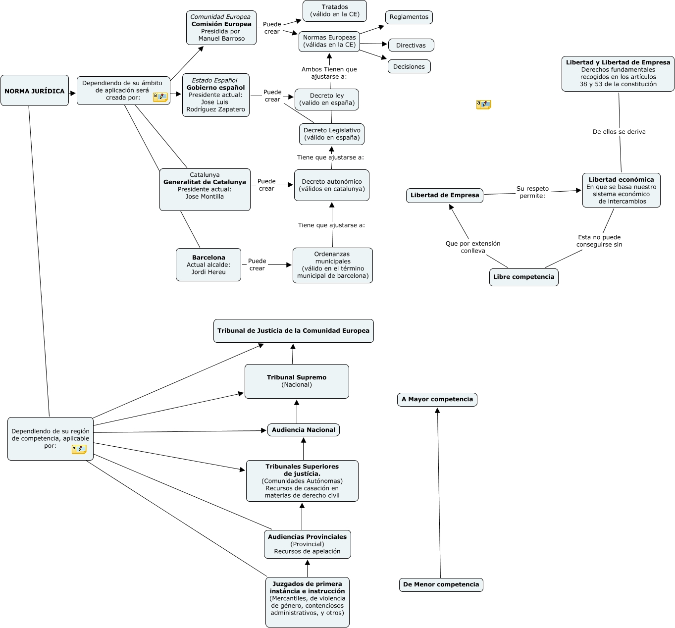 Aquest mapa conceptual conté informació relacionada amb: primer caso, Libertad de Empresa Su respeto permite: Libertad económica En que se basa nuestro sistema económico de intercambios, De Menor competencia ???? A Mayor competencia, NORMA JURÍDICA ???? Dependiendo de su ámbito de aplicación será creada por:, Dependiendo de su ámbito de aplicación será creada por: ???? Estado Español Gobierno español Presidente actual: Jose Luis Rodríguez Zapatero, Dependiendo de su región de competencia, aplicable por: ???? Audiencias Provinciales (Provincial) Recursos de apelación, Decreto Legislativo (válido en españa) Ambos Tienen que ajustarse a: Normas Europeas (válidas en la CE), Normas Europeas (válidas en la CE) ???? Decisiones, Tribunales Superiores de justícia. (Comunidades Autónomas) Recursos de casación en materias de derecho civil ???? Audiencia Nacional, Dependiendo de su región de competencia, aplicable por: ???? Audiencia Nacional, Dependiendo de su región de competencia, aplicable por: ???? Tribunal Supremo (Nacional), Dependiendo de su ámbito de aplicación será creada por: ???? Catalunya Generalitat de Catalunya Presidente actual: Jose Montilla, Dependiendo de su región de competencia, aplicable por: ???? Juzgados de primera instáncia e instrucción (Mercantiles, de violencia de género, contenciosos administrativos, y otros), Catalunya Generalitat de Catalunya Presidente actual: Jose Montilla Puede crear Decreto autonómico (válidos en catalunya), Estado Español Gobierno español Presidente actual: Jose Luis Rodríguez Zapatero Puede crear Decreto ley (valido en españa), Barcelona Actual alcalde: Jordi Hereu Puede crear Ordenanzas municipales (válido en el término municipal de barcelona), Decreto autonómico (válidos en catalunya) Tiene que ajustarse a: Decreto Legislativo (válido en españa), Libre competencia Que por extensión conlleva Libertad de Empresa, NORMA JURÍDICA ???? Dependiendo de su región de competencia, aplicable por:, Comunidad Europea Comisión Europea Presidida por Manuel Barroso Puede crear Normas Europeas (válidas en la CE), Normas Europeas (válidas en la CE) ???? Directivas