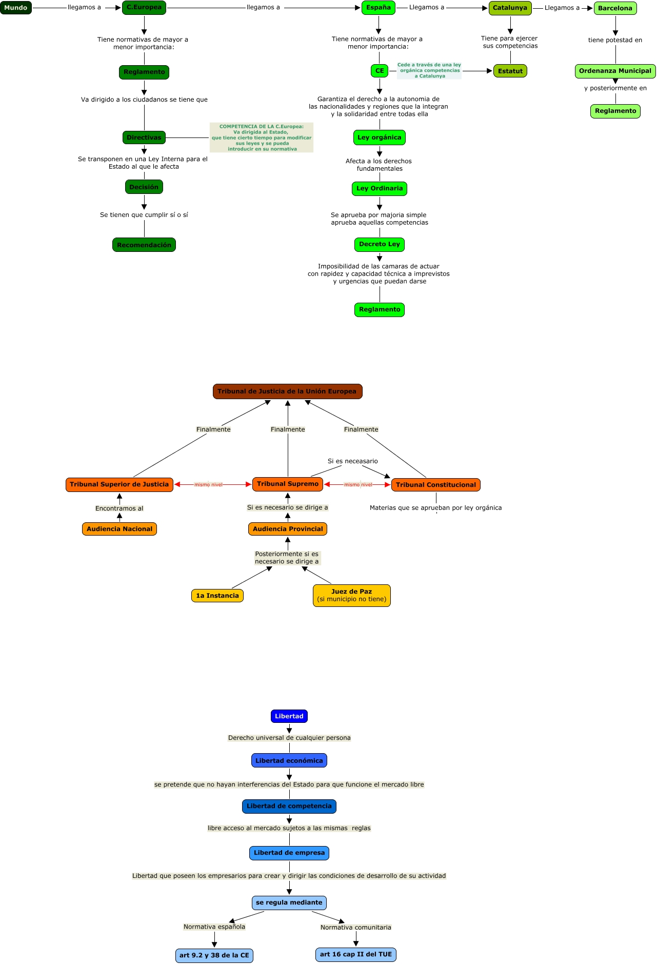 Este Cmap, tiene información relacionada con: CASO 1 ESTER BARTOLOMÉ, Decreto Ley Imposibilidad de las camaras de actuar con rapidez y capacidad técnica a imprevistos y urgencias que puedan darse Reglamento, se regula mediante Normativa comunitaria art 16 cap II del TUE, Reglamento Va dirigido a los ciudadanos se tiene que Directivas, Libertad de empresa Libertad que poseen los empresarios para crear y dirigir las condiciones de desarrollo de su actividad se regula mediante, Libertad económica se pretende que no hayan interferencias del Estado para que funcione el mercado libre Libertad de competencia, C.Europea llegamos a España, Ley Ordinaria Se aprueba por majoria simple aprueba aquellas competencias Decreto Ley, Juez de Paz (si municipio no tiene) Posteriormente si es necesario se dirige a Audiencia Provincial, Mundo llegamos a C.Europea, Catalunya Llegamos a Barcelona, Tribunal Superior de Justicia mismo nivel Tribunal Supremo, Libertad Derecho universal de cualquier persona Libertad económica, se regula mediante Normativa española art 9.2 y 38 de la CE, Directivas ???? COMPETENCIA DE LA C.Europea: Va dirigida al Estado, que tiene cierto tiempo para modificar sus leyes y se pueda introducir en su normativa, Libertad de competencia libre acceso al mercado sujetos a las mismas reglas Libertad de empresa, Ley orgánica Afecta a los derechos fundamentales Ley Ordinaria, Decisión Se tienen que cumplir sí o sí Recomendación, C.Europea Tiene normativas de mayor a menor importancia: Reglamento, Tribunal Constitucional Materias que se aprueban por ley orgánica, CE Garantiza el derecho a la autonomia de las nacionalidades y regiones que la integran y la solidaridad entre todas ella Ley orgánica