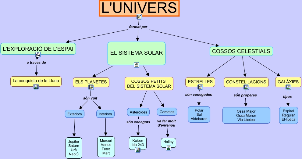 Aquest mapa conceptual conté informació relacionada amb: L'univers 4, L'EXPLORACIÓ DE L'ESPAI a través de La conquista de la Lluna, L'UNIVERS format per EL SISTEMA SOLAR, Interiors Mercuri Venus Terra Mart, GALÀXIES tipus Espiral Regular El·líptica, Cometes va fer molt d'enrenou Halley, ESTRELLES són conegudes Polar Sol Aldebaran, L'UNIVERS format per L'EXPLORACIÓ DE L'ESPAI, COSSOS CELESTIALS ESTRELLES, COSSOS PETITS DEL SISTEMA SOLAR Asteroides, L'UNIVERS format per COSSOS CELESTIALS, EL SISTEMA SOLAR ELS PLANETES, EL SISTEMA SOLAR COSSOS PETITS DEL SISTEMA SOLAR, Exteriors Júpiter Saturn Urà Neptú, ELS PLANETES són vuit Interiors, COSSOS CELESTIALS GALÀXIES, ELS PLANETES són vuit Exteriors, COSSOS CELESTIALS CONSTEL·LACIONS, CONSTEL·LACIONS són properes Ossa Major Ossa Menor Via Làctea, Asteroides són coneguts Kuiper Ida 243, COSSOS PETITS DEL SISTEMA SOLAR Cometes