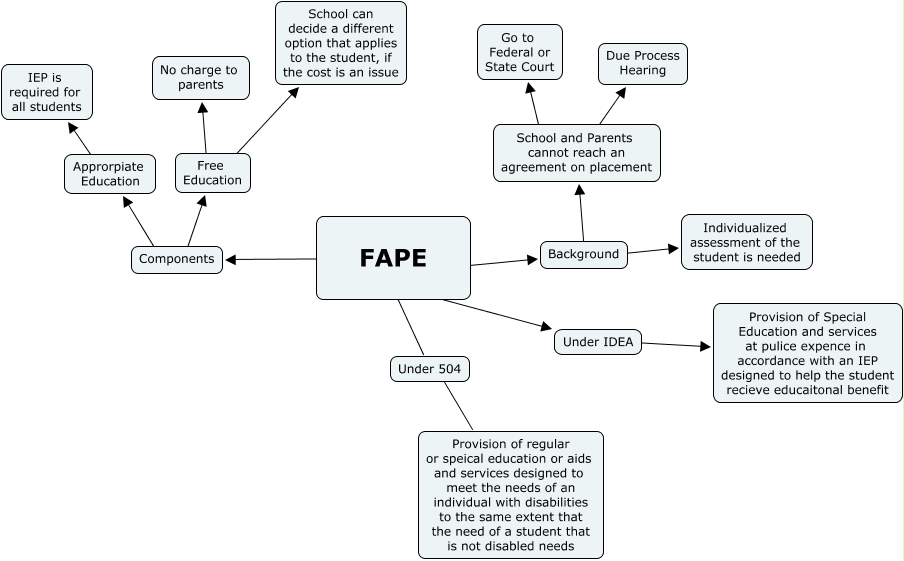 This Concept Map, created with IHMC CmapTools, has information related to: FAPE, FAPE ???? Under 504, Under IDEA ???? Provision of Special Education and services at pulice expence in accordance with an IEP designed to help the student recieve educaitonal benefit, Components ???? Approrpiate Education, FAPE ???? Under IDEA, Approrpiate Education ???? IEP is required for all students, Free Education ???? School can decide a different option that applies to the student, if the cost is an issue, FAPE ???? Components, School and Parents cannot reach an agreement on placement ???? Go to Federal or State Court, School and Parents cannot reach an agreement on placement ???? Due Process Hearing, Components ???? Free Education, Background ???? Individualized assessment of the student is needed, Free Education ???? No charge to parents, Under 504 ???? Provision of regular or speical education or aids and services designed to meet the needs of an individual with disabilities to the same extent that the need of a student that is not disabled needs, Background ???? School and Parents cannot reach an agreement on placement, FAPE ???? Background