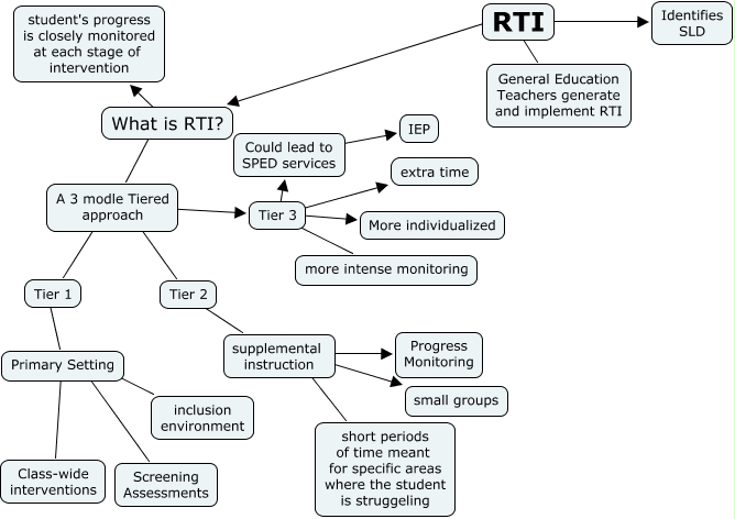 This Concept Map, created with IHMC CmapTools, has information related to: RTI, Primary Setting ???? inclusion environment, Tier 3 ???? more intense monitoring, What is RTI? ???? student's progress is closely monitored at each stage of intervention, Tier 2 ???? supplemental instruction, supplemental instruction ???? short periods of time meant for specific areas where the student is struggeling, A 3 modle Tiered approach ???? Tier 1, A 3 modle Tiered approach ???? Tier 2, supplemental instruction ???? Progress Monitoring, Tier 1 ???? Primary Setting, Could lead to SPED services ???? IEP, Tier 3 ???? Could lead to SPED services, Tier 3 ???? More individualized, What is RTI? ???? A 3 modle Tiered approach, RTI ???? Identifies SLD, RTI ???? General Education Teachers generate and implement RTI, A 3 modle Tiered approach ???? Tier 3, RTI ???? What is RTI?, Tier 3 ???? extra time, Primary Setting ???? Screening Assessments, supplemental instruction ???? small groups