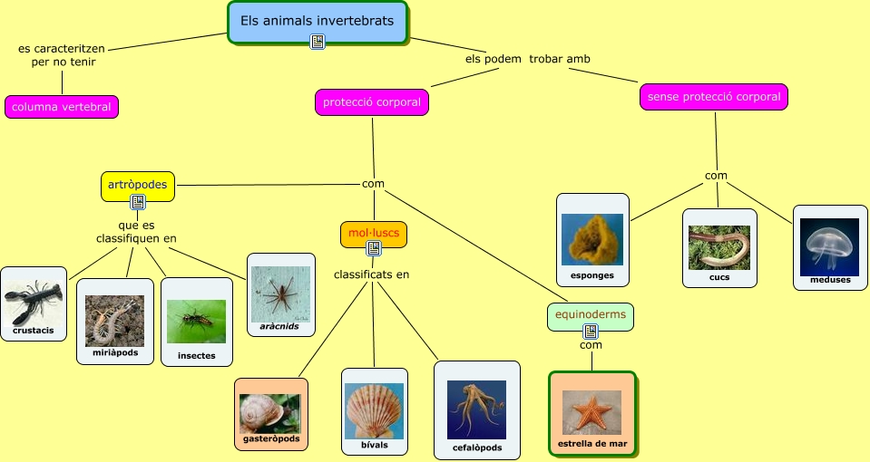 Este Cmap, tiene información relacionada con: PRESENTACIÓ invertebrats, Els animals invertebrats els podem trobar amb protecció corporal, Els animals invertebrats els podem trobar amb sense protecció corporal, sense protecció corporal com meduses, equinoderms com estrella de mar, artròpodes que es classifiquen en insectes, sense protecció corporal com cucs, protecció corporal com equinoderms, mol·luscs classificats en bívals, artròpodes que es classifiquen en miriàpods, Els animals invertebrats es caracteritzen per no tenir columna vertebral, mol·luscs classificats en gasteròpods, artròpodes que es classifiquen en aràcnids, sense protecció corporal com esponges, artròpodes que es classifiquen en crustacis, protecció corporal com mol·luscs, protecció corporal com artròpodes, mol·luscs classificats en cefalòpods