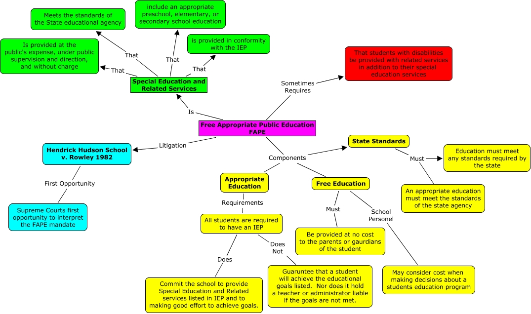 This Concept Map, created with IHMC CmapTools, has information related to: FAPE, Free Appropriate Public Education FAPE Components Appropriate Education, All students are required to have an IEP Does Commit the school to provide Special Education and Related services listed in IEP and to making good effort to achieve goals., Special Education and Related Services That Meets the standards of the State educational agency, State Standards Must Education must meet any standards required by the state, Free Appropriate Public Education FAPE Is Special Education and Related Services, Free Education School Personel May consider cost when making decisions about a students education program, Special Education and Related Services That Is provided at the public's expense, under public supervision and direction, and without charge, Free Appropriate Public Education FAPE Sometimes Requires That students with disabilities be provided with related services in addition to their special education services, State Standards Must An appropriate education must meet the standards of the state agency, Special Education and Related Services That include an appropriate preschool, elementary, or secondary school education, Free Appropriate Public Education FAPE Litigation Hendrick Hudson School v. Rowley 1982, Free Appropriate Public Education FAPE Components Free Education, Appropriate Education Requirements All students are required to have an IEP, Free Education Must Be provided at no cost to the parents or gaurdians of the student, All students are required to have an IEP Does Not Guaruntee that a student will achieve the educational goals listed. Nor does it hold a teacher or administrator liable if the goals are not met., Hendrick Hudson School v. Rowley 1982 First Opportunity Supreme Courts first opportunity to interpret the FAPE mandate, Special Education and Related Services That is provided in conformity with the IEP, Free Appropriate Public Education FAPE Components State Standards
