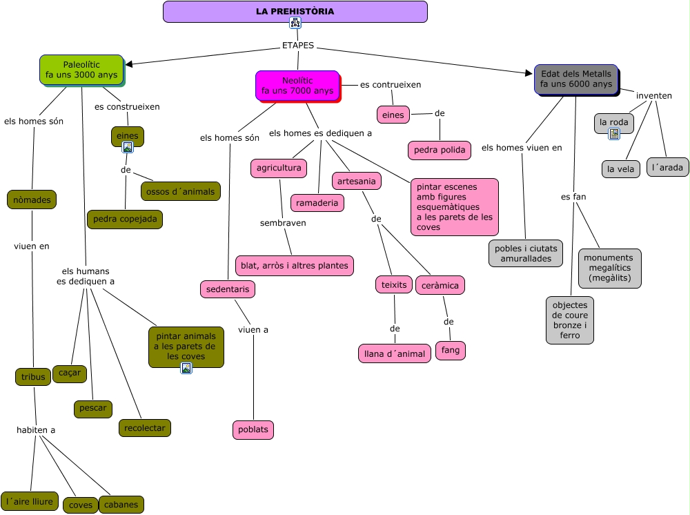 Este Cmap, tiene información relacionada con: La Prehistòria, Neolític fa uns 7000 anys els homes són sedentaris, eines de pedra polida, Paleolític fa uns 3000 anys es construeixen eines, Paleolític fa uns 3000 anys els humans es dediquen a caçar, Neolític fa uns 7000 anys es contrueixen eines, LA PREHISTÒRIA ETAPES Neolític fa uns 7000 anys, sedentaris viuen a poblats, tribus habiten a l´aire lliure, tribus habiten a coves, Edat dels Metalls fa uns 6000 anys inventen la roda, artesania de ceràmica, Paleolític fa uns 3000 anys els humans es dediquen a recolectar, Neolític fa uns 7000 anys els homes es dediquen a ramaderia, tribus habiten a cabanes, Neolític fa uns 7000 anys els homes es dediquen a pintar escenes amb figures esquemàtiques a les parets de les coves, Edat dels Metalls fa uns 6000 anys inventen l´arada, Paleolític fa uns 3000 anys els humans es dediquen a pintar animals a les parets de les coves, Edat dels Metalls fa uns 6000 anys es fan objectes de coure bronze i ferro, Edat dels Metalls fa uns 6000 anys es fan monuments megalítics (megàlits), Paleolític fa uns 3000 anys els humans es dediquen a pescar