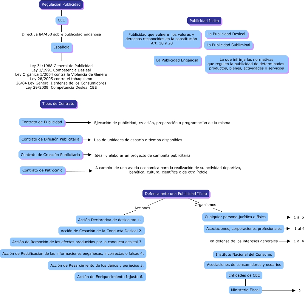 Este Cmap, tiene información relacionada con: Caso 2, Defensa ante una Publicidad Ilícita Organismos Cualquier persona jurídica o física, Contrato de Difusión Publicitaria ???? Uso de unidades de espacio o tiempo disponibles, Contrato de Patrocinio ???? A cambio de una ayuda económica para la realización de su actividad deportiva, benéfica, cultura, científica o de otra índole, Entidades de CEE ???? Ministerio Fiscal, Ministerio Fiscal ???? 2, Contrato de Publicidad ???? Ejecución de publicidad, creación, preparación o programación de la misma, Española ???? Ley 34/1988 General de Publicidad Ley 3/1991 Competencia Desleal Ley Orgánica 1/2004 contra la Violencia de Género Ley 28/2005 contra el tabaquismo 26/84 Ley General Denfensa de los Consumidores Ley 29/2009 Competencia Desleal CEE, Defensa ante una Publicidad Ilícita Acciones Acción Declarativa de deslealtad 1., Cualquier persona jurídica o física ???? 1 al 5, Regulación Publicidad CEE, CEE Directiva 84/450 sobre publicidad engañosa Española, Contrato de Creación Publicitaria ???? Idear y elaborar un proyecto de campaña publicitaria, Asociaciones, corporaciones profesionales en defensa de los intereses generales 1 al 4, Asociaciones, corporaciones profesionales ???? 1 al 4, Asociaciones, corporaciones profesionales en defensa de los intereses generales Instituto Nacional del Consumo