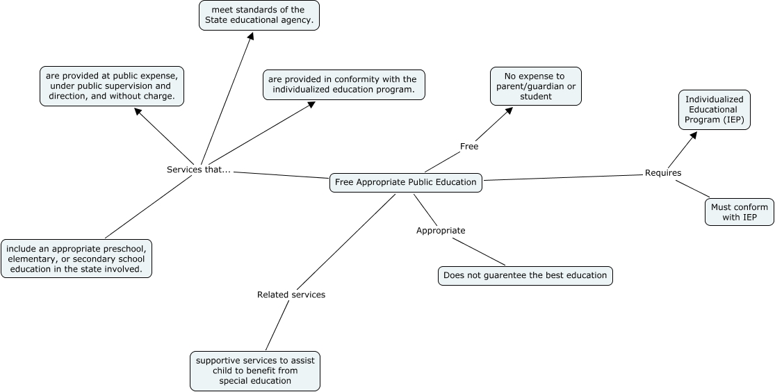 This Concept Map, created with IHMC CmapTools, has information related to: Jennifer Cottrell FAPE, Free Appropriate Public Education Services that... are provided at public expense, under public supervision and direction, and without charge., Free Appropriate Public Education Services that... are provided in conformity with the individualized education program., Free Appropriate Public Education Requires Individualized Educational Program (IEP), Free Appropriate Public Education Appropriate Does not guarentee the best education, Free Appropriate Public Education Related services supportive services to assist child to benefit from special education, Free Appropriate Public Education Services that... meet standards of the State educational agency., Free Appropriate Public Education Requires Must conform with IEP, Free Appropriate Public Education Services that... include an appropriate preschool, elementary, or secondary school education in the state involved., Free Appropriate Public Education Free No expense to parent/guardian or student
