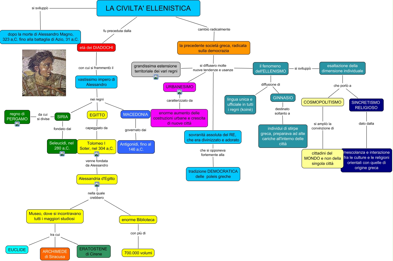Questa Cmap, creata con IHMC CmapTools, contiene informazioni relative a: la cultura ELLENISTICA Molte & Piancia, la precedente società greca, radicata sulla democrazia si diffusero molte nuove tendenze e usanze URBANESIMO, vastissimo impero di Alessandro nei regni SIRIA, LA CIVILTA' ELLENISTICA cambiò radicalmente la precedente società greca, radicata sulla democrazia, età dei DIADOCHI con cui si frammentò il vastissimo impero di Alessandro, Tolomeo I Soter, nel 304 a,C. venne fondata da Alessandro Alessandria d'Egitto, la precedente società greca, radicata sulla democrazia si diffusero molte nuove tendenze e usanze grandissima estensione territoriale dei vari regni, esaltazione della dimensione individuale che portò a COSMOPOLITISMO, il fenomeno dell'ELLENISMO si sviluppò esaltazione della dimensione individuale, SINCRETISMO RELIGIOSO dato dalla mescolanza e interazione fra le culture e le religioni orientali con quelle di origine greca, SIRIA fondato dai Seleucidi, nel 280 a,C., Alessandria d'Egitto nella quale crebbero enorme Biblioteca, MACEDONIA governato dai Antigonidi, fino al 146 a,C., la precedente società greca, radicata sulla democrazia si diffusero molte nuove tendenze e usanze il fenomeno dell'ELLENISMO, la precedente società greca, radicata sulla democrazia si diffusero molte nuove tendenze e usanze sovranità assoluta del RE, che era divinizzato e adorato, URBANESIMO caratterizzato da enorme aumento delle costruzioni urbane e crescita di nuove città, SIRIA da cui si divise regno di PERGAMO, vastissimo impero di Alessandro nei regni EGITTO, esaltazione della dimensione individuale che portò a SINCRETISMO RELIGIOSO, il fenomeno dell'ELLENISMO diffusione di GINNASIO, Museo, dove si incontravano tutti i maggiori studiosi tra cui ARCHIMEDE di Siracusa