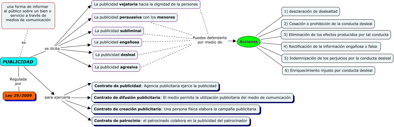 Este Cmap, tiene información relacionada con: Cmap2 (Publicidad), Acciones ???? 6) Enriquecimiento injusto por conducta desleal, PUBLICIDAD para ejercerla Contrato de creación publicitaria: Una persona física elabora la campaña publicitaria, PUBLICIDAD para ejercerla Contrato de difusión publicitaria: El medio permite la utilización publicitaria del medio de comunicación, PUBLICIDAD es ilícita La publicidad subliminal, Acciones ???? 2) Cesación o prohibición de la conducta desleal, La publicidad subliminal Puedes defenderte por medio de Acciones, La publicidad desleal Puedes defenderte por medio de Acciones, PUBLICIDAD es ilícita La publicidad vejatoria hacia la dignidad de la personas, PUBLICIDAD es ilícita La publicidad engañosa, Acciones ???? 4) Rectificación de la información engañosa o falsa, PUBLICIDAD para ejercerla Contrato de publicidad: Agencia publicitaria ejerce la publicidad, La publicidad engañosa Puedes defenderte por medio de Acciones, PUBLICIDAD para ejercerla Contrato de patrocinio: el patrocinado colabora en la publicidad del patrocinador, Acciones ???? 3) Eliminación de los efectos producidos por tal conducta, PUBLICIDAD Regulada por Ley 29/2009, La publicidad agresiva Puedes defenderte por medio de Acciones, PUBLICIDAD es ilícita La publicidad persuasiva con los menores, Acciones ???? 5) Indemnización de los perjuicios por la conducta desleal, PUBLICIDAD es una forma de informar al público sobre un bien o servicio a través de medios de comunicación, Acciones ???? 1) desclaración de deslealtad