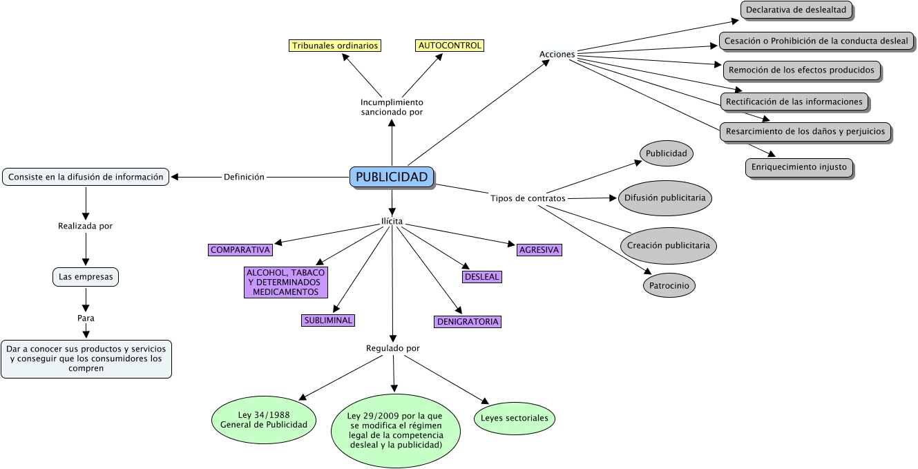 Este Cmap, tiene información relacionada con: PUBLICIDAD, PUBLICIDAD Tipos de contratos Difusión publicitaria, PUBLICIDAD Ilícita SUBLIMINAL, PUBLICIDAD Ilícita DENIGRATORIA, PUBLICIDAD Regulado por Ley 34/1988 General de Publicidad, PUBLICIDAD Ilícita AGRESIVA, PUBLICIDAD Acciones Remoción de los efectos producidos, PUBLICIDAD Ilícita DESLEAL, PUBLICIDAD Acciones Cesación o Prohibición de la conducta desleal, PUBLICIDAD Regulado por Ley 29/2009 por la que se modifica el régimen legal de la competencia desleal y la publicidad), PUBLICIDAD Definición Consiste en la difusión de información, PUBLICIDAD Incumplimiento sancionado por Tribunales ordinarios, Consiste en la difusión de información Realizada por Las empresas, PUBLICIDAD Acciones Resarcimiento de los daños y perjuicios, PUBLICIDAD Tipos de contratos Publicidad, PUBLICIDAD Incumplimiento sancionado por AUTOCONTROL, Las empresas Para Dar a conocer sus productos y servicios y conseguir que los consumidores los compren, PUBLICIDAD Acciones Enriquecimiento injusto, PUBLICIDAD Acciones Declarativa de deslealtad, PUBLICIDAD Tipos de contratos Creación publicitaria, PUBLICIDAD Tipos de contratos Patrocinio
