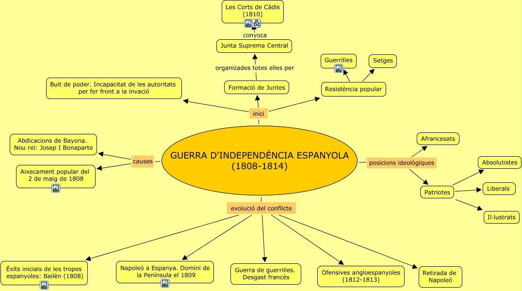 Este Cmap, tiene información relacionada con: La guerra d'Independència espanyola, Junta Suprema Central convoca Les Corts de Càdis (1810), GUERRA D'INDEPENDÈNCIA ESPANYOLA (1808-1814) evolució del conflicte Napoleó a Espanya. Domini de la Península el 1809, Resistència popular Guerrilles, GUERRA D'INDEPENDÈNCIA ESPANYOLA (1808-1814) inici Formació de Juntes, GUERRA D'INDEPENDÈNCIA ESPANYOLA (1808-1814) inici Buit de poder. Incapacitat de les autoritats per fer front a la invació, Patriotes Liberals, GUERRA D'INDEPENDÈNCIA ESPANYOLA (1808-1814) causes Abdicacions de Bayona. Nou rei: Josep I Bonaparte, GUERRA D'INDEPENDÈNCIA ESPANYOLA (1808-1814) evolució del conflicte Retirada de Napoleó, Patriotes Absolutistes, GUERRA D'INDEPENDÈNCIA ESPANYOLA (1808-1814) causes Aixecament popular del 2 de maig de 1808, Resistència popular Setges, Patriotes Il·lustrats, GUERRA D'INDEPENDÈNCIA ESPANYOLA (1808-1814) inici Resistència popular, GUERRA D'INDEPENDÈNCIA ESPANYOLA (1808-1814) posicions ideològiques Patriotes, GUERRA D'INDEPENDÈNCIA ESPANYOLA (1808-1814) evolució del conflicte Ofensives angloespanyoles (1812-1813), Formació de Juntes organizades totes elles per Junta Suprema Central, GUERRA D'INDEPENDÈNCIA ESPANYOLA (1808-1814) posicions ideològiques Afrancesats, GUERRA D'INDEPENDÈNCIA ESPANYOLA (1808-1814) evolució del conflicte Guerra de guerrilles. Desgast francès, GUERRA D'INDEPENDÈNCIA ESPANYOLA (1808-1814) evolució del conflicte Èxits inicials de les tropes espanyoles: Bailèn (1808)
