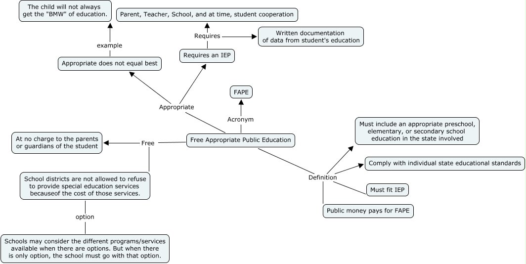This Concept Map, created with IHMC CmapTools, has information related to: FAPE CMAP, Free Appropriate Public Education Free School districts are not allowed to refuse to provide special education services becauseof the cost of those services., Free Appropriate Public Education Definition Comply with individual state educational standards, Free Appropriate Public Education Definition Must fit IEP, Free Appropriate Public Education Definition Public money pays for FAPE, Free Appropriate Public Education Appropriate Requires an IEP, Free Appropriate Public Education Definition Must include an appropriate preschool, elementary, or secondary school education in the state involved, Free Appropriate Public Education Free At no charge to the parents or guardians of the student, School districts are not allowed to refuse to provide special education services becauseof the cost of those services. option Schools may consider the different programs/services available when there are options. But when there is only option, the school must go with that option., Free Appropriate Public Education Acronym FAPE, Requires an IEP Requires Parent, Teacher, School, and at time, student cooperation, Requires an IEP Requires Written documentation of data from student's education, Appropriate does not equal best example The child will not always get the "BMW" of education., Free Appropriate Public Education Appropriate Appropriate does not equal best