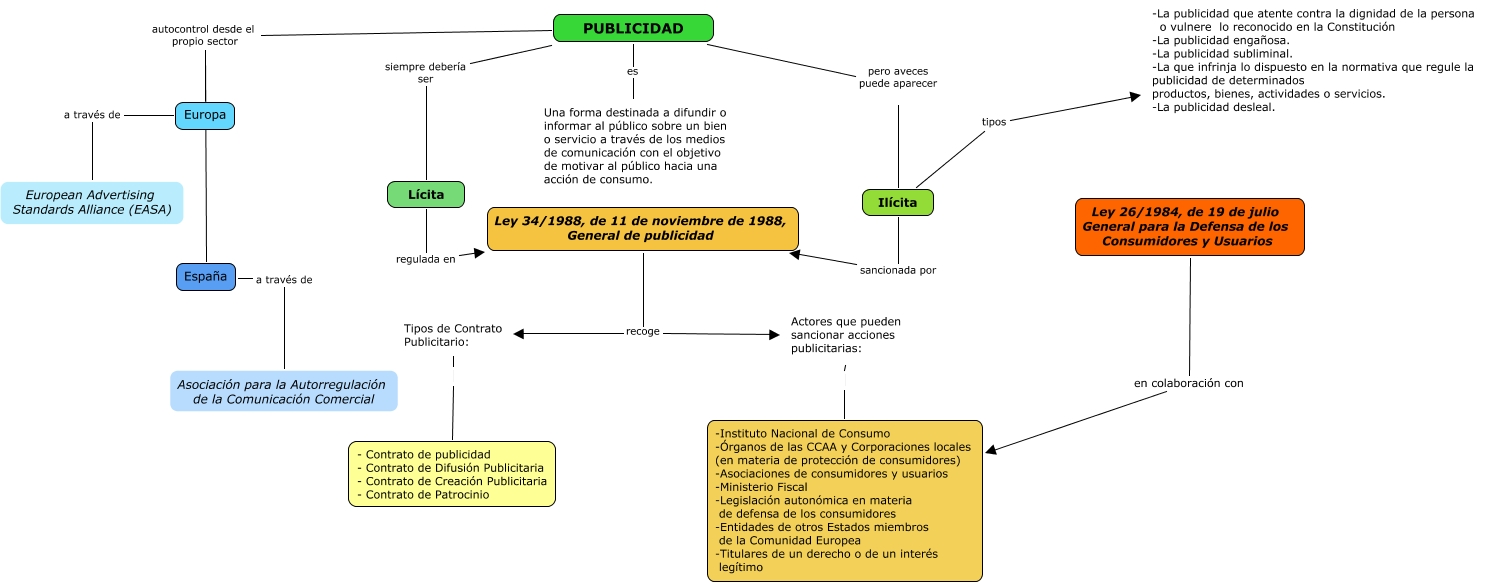 Este Cmap, tiene información relacionada con: Mapa Conceptual CASO 2, PUBLICIDAD autocontrol desde el propio sector España, Ley 26/1984, de 19 de julio General para la Defensa de los Consumidores y Usuarios en colaboración con -Instituto Nacional de Consumo -Órganos de las CCAA y Corporaciones locales (en materia de protección de consumidores) -Asociaciones de consumidores y usuarios -Ministerio Fiscal -Legislación autonómica en materia de defensa de los consumidores -Entidades de otros Estados miembros de la Comunidad Europea -Titulares de un derecho o de un interés legítimo, PUBLICIDAD pero aveces puede aparecer Ilícita, PUBLICIDAD siempre debería ser Lícita, Ilícita sancionada por Ley 34/1988, de 11 de noviembre de 1988, General de publicidad, Ley 34/1988, de 11 de noviembre de 1988, General de publicidad recoge Actores que pueden sancionar acciones publicitarias:, Actores que pueden sancionar acciones publicitarias: -Instituto Nacional de Consumo -Órganos de las CCAA y Corporaciones locales (en materia de protección de consumidores) -Asociaciones de consumidores y usuarios -Ministerio Fiscal -Legislación autonómica en materia de defensa de los consumidores -Entidades de otros Estados miembros de la Comunidad Europea -Titulares de un derecho o de un interés legítimo, PUBLICIDAD es Una forma destinada a difundir o informar al público sobre un bien o servicio a través de los medios de comunicación con el objetivo de motivar al público hacia una acción de consumo., Tipos de Contrato Publicitario: - Contrato de publicidad - Contrato de Difusión Publicitaria - Contrato de Creación Publicitaria - Contrato de Patrocinio, Ley 34/1988, de 11 de noviembre de 1988, General de publicidad recoge Tipos de Contrato Publicitario:, España a través de Asociación para la Autorregulación de la Comunicación Comercial, Europa a través de European Advertising Standards Alliance (EASA), Lícita regulada en Ley 34/1988, de 11 de noviembre de 1988, General de publicidad, PUBLICIDAD autocontrol desde el propio sector Europa, Ilícita tipos -La publicidad que atente contra la dignidad de la persona o vulnere lo reconocido en la Constitución -La publicidad engañosa. -La publicidad subliminal. -La que infrinja lo dispuesto en la normativa que regule la publicidad de determinados productos, bienes, actividades o servicios. -La publicidad desleal.