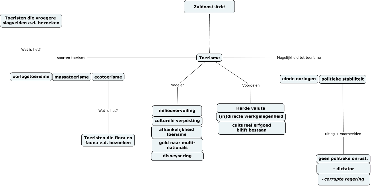 Deze Concept Map heeft informatie gerelateerd aan: 2 Zuidoost-Azië als vakantieland, Toerisme soorten toerisme massatoerisme, Toerisme Nadelen milieuvervuiling, oorlogstoerisme Wat is het? Toeristen die vroegere slagvelden e.d. bezoeken, Toerisme Mogelijkheid tot toerisme einde oorlogen, politieke stabiliteit uitleg + voorbeelden geen politieke onrust., ecotoerisme Wat is het? Toeristen die flora en fauna e.d. bezoeken, Zuidoost-Azië Toerisme, Toerisme Voordelen Harde valuta