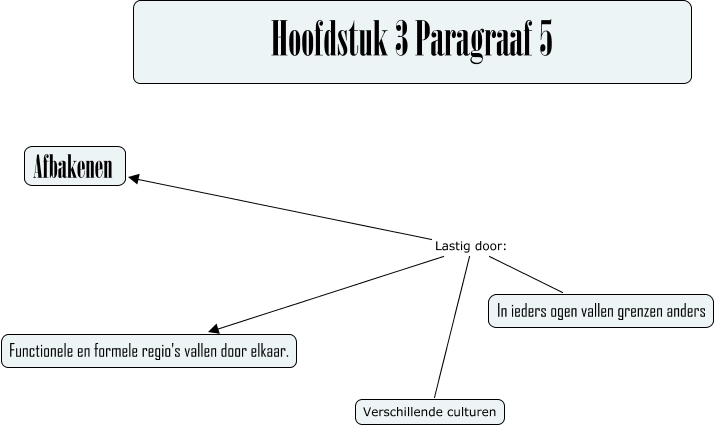 Deze Concept Map heeft informatie gerelateerd aan: Zonder titel 2, Verschillende culturen Lastig door: Afbakenen, Verschillende culturen Lastig door: <math xmlns="http://www.w3.org/1998/Math/MathML"> <mrow> <mtext> Functionele en formele regio's vallen door elkaar. </mtext> </mrow> </math>, Verschillende culturen Lastig door: In ieders ogen vallen grenzen anders