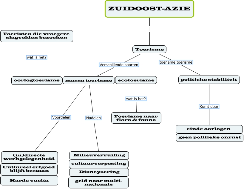 Deze Concept Map heeft informatie gerelateerd aan: Zuidoost-azie, massa toerisme ???? ecotoerisme, Toerisme Verschillende soorten massa toerisme, ZUIDOOST-AZIE Toerisme, ecotoerisme wat is het? Toerisme naar flora & fauna, massa toerisme Voordelen (in)directe werkgelegenheid, politieke stabiliteit Komt door einde oorlogen, oorlogtoerisme wat is het? Toeristen die vroegere slagvelden bezoeken, massa toerisme Nadelen Milieuvervuiling, Toerisme toename toerisme politieke stabiliteit