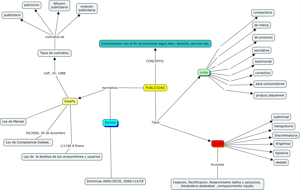 Este Cmap, tiene información relacionada con: PUBLICIDAD, Ilicita ???? subliminal, Ilicita ???? Discriminatoria, Tipos de contratos; contratos de patrocinio, Ilicita ???? Denigratoria, Europa ???? Directivas 2005/29/CE, 2006/114/CE, Ilicita ???? Agresiva, Ilicita Acciones Cesacion, Rectificacion, Resarcimiento daños y perjuicios, Declarativa deslealtad , enriquecimiento injusto, Licita para consumidores, PUBLICIDAD Tipos Ilicita, PUBLICIDAD normativa Europa, Licita comparativa, Ilicita ???? desleal, PUBLICIDAD Tipos Licita, Licita de marca, España 1/1190 8 Enero Ley de la denfesa de los consumidores y usuarios, Tipos de contratos; contratos de publicitario, España LGP, 34, 1988 Tipos de contratos;, Licita product placement, Tipos de contratos; contratos de difusion publicitaria, España 29/2009, 30 de diciembre Ley de Competencia Desleal,