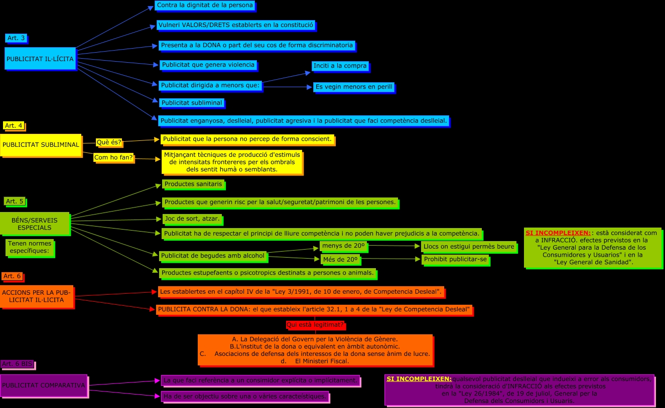 Aquest mapa conceptual conté informació relacionada amb: PRACTICA 2_Publicitat, BÉNS/SERVEIS ESPECIALS Publicitat ha de respectar el principi de lliure competència i no poden haver prejudicis a la competència., ACCIONS PER LA PUB- LICITAT IL·LICITA ???? PUBLICITA CONTRA LA DONA: el que estableix l'article 32.1, 1 a 4 de la "Ley de Competencia Desleal", PUBLICITAT IL·LÍCITA Publicitat subliminal, Publicitat dirigida a menors que: ???? Inciti a la compra, Publicitat dirigida a menors que: Publicitat subliminal, PUBLICITA CONTRA LA DONA: el que estableix l'article 32.1, 1 a 4 de la "Ley de Competencia Desleal" Qui està legitimat? A. La Delegació del Govern per la Violència de Gènere. B.L'institut de la dona o equivalent en àmbit autonòmic. C. Asociacions de defensa dels interessos de la dona sense ànim de lucre. d. El Ministeri Fiscal., PUBLICITAT IL·LÍCITA Presenta a la DONA o part del seu cos de forma discriminatoria, Publicitat de begudes amb alcohol Productes estupefaents o psicotropics destinats a persones o animals., Publicitat dirigida a menors que: Contra la dignitat de la persona, ???? Què és? Publicitat que la persona no percep de forma conscient., Publicitat de begudes amb alcohol Joc de sort, atzar., BÉNS/SERVEIS ESPECIALS Productes que generin risc per la salut/seguretat/patrimoni de les persones., PUBLICITAT IL·LÍCITA Publicitat que genera violencia, PUBLICITAT IL·LÍCITA Publicitat enganyosa, deslleial, publicitat agresiva i la publicitat que faci competència deslleial., Publicitat dirigida a menors que: Presenta a la DONA o part del seu cos de forma discriminatoria, ACCIONS PER LA PUB- LICITAT IL·LICITA ???? Les establertes en el capítol IV de la "Ley 3/1991, de 10 de enero, de Competencia Desleal"., Més de 20º ???? Prohibit publicitar-se, Publicitat de begudes amb alcohol Productes sanitaris, Publicitat dirigida a menors que: Publicitat que genera violencia, Publicitat dirigida a menors que: Publicitat enganyosa, deslleial, publicitat agresiva i la publicitat que faci competència deslleial.