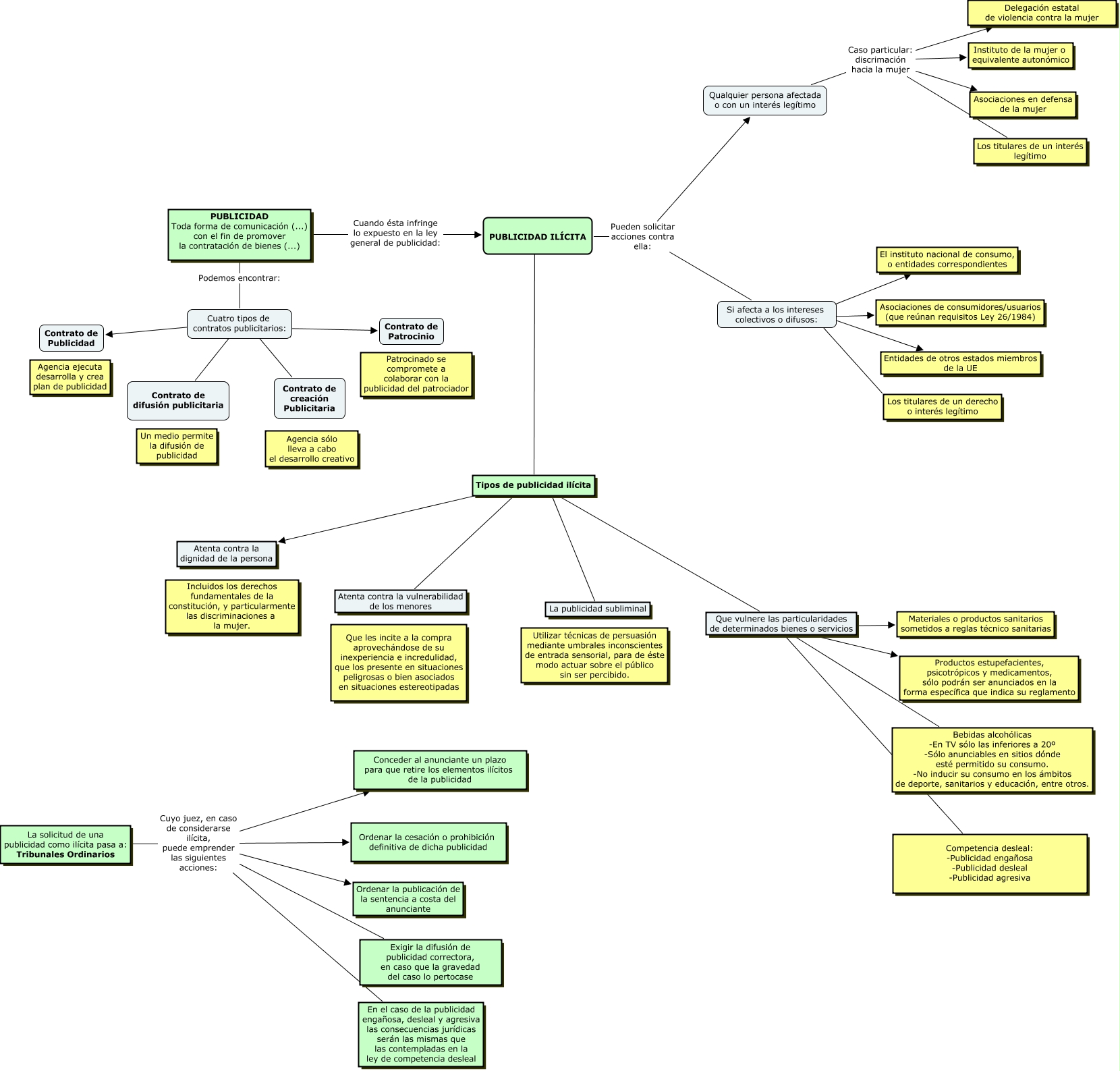 Este Cmap, tiene información relacionada con: segundo caso, Que vulnere las particularidades de determinados bienes o servicios ???? Competencia desleal: -Publicidad engañosa -Publicidad desleal -Publicidad agresiva, PUBLICIDAD Toda forma de comunicación (...) con el fin de promover la contratación de bienes (...) Cuando ésta infringe lo expuesto en la ley general de publicidad: PUBLICIDAD ILÍCITA, PUBLICIDAD Toda forma de comunicación (...) con el fin de promover la contratación de bienes (...) Podemos encontrar: Cuatro tipos de contratos publicitarios:, Si afecta a los intereses colectivos o difusos: ???? Los titulares de un derecho o interés legítimo, PUBLICIDAD ILÍCITA ???? Tipos de publicidad ilícita, Si afecta a los intereses colectivos o difusos: ???? Asociaciones de consumidores/usuarios (que reúnan requisitos Ley 26/1984), Si afecta a los intereses colectivos o difusos: ???? Entidades de otros estados miembros de la UE, PUBLICIDAD ILÍCITA Pueden solicitar acciones contra ella: Qualquier persona afectada o con un interés legítimo, Qualquier persona afectada o con un interés legítimo Caso particular: discrimación hacia la mujer Asociaciones en defensa de la mujer, Tipos de publicidad ilícita ???? Que vulnere las particularidades de determinados bienes o servicios, Qualquier persona afectada o con un interés legítimo Caso particular: discrimación hacia la mujer Los titulares de un interés legítimo, Cuatro tipos de contratos publicitarios: ???? Contrato de creación Publicitaria, La solicitud de una publicidad como ilícita pasa a: Tribunales Ordinarios Cuyo juez, en caso de considerarse ilícita, puede emprender las siguientes acciones: En el caso de la publicidad engañosa, desleal y agresiva las consecuencias jurídicas serán las mismas que las contempladas en la ley de competencia desleal, Cuatro tipos de contratos publicitarios: ???? Contrato de Publicidad, Que vulnere las particularidades de determinados bienes o servicios ???? Materiales o productos sanitarios sometidos a reglas técnico sanitarias, La solicitud de una publicidad como ilícita pasa a: Tribunales Ordinarios Cuyo juez, en caso de considerarse ilícita, puede emprender las siguientes acciones: Ordenar la publicación de la sentencia a costa del anunciante, La solicitud de una publicidad como ilícita pasa a: Tribunales Ordinarios Cuyo juez, en caso de considerarse ilícita, puede emprender las siguientes acciones: Ordenar la cesación o prohibición definitiva de dicha publicidad, Que vulnere las particularidades de determinados bienes o servicios ???? Productos estupefacientes, psicotrópicos y medicamentos, sólo podrán ser anunciados en la forma específica que indica su reglamento, La solicitud de una publicidad como ilícita pasa a: Tribunales Ordinarios Cuyo juez, en caso de considerarse ilícita, puede emprender las siguientes acciones: Exigir la difusión de publicidad correctora, en caso que la gravedad del caso lo pertocase, Tipos de publicidad ilícita ???? La publicidad subliminal