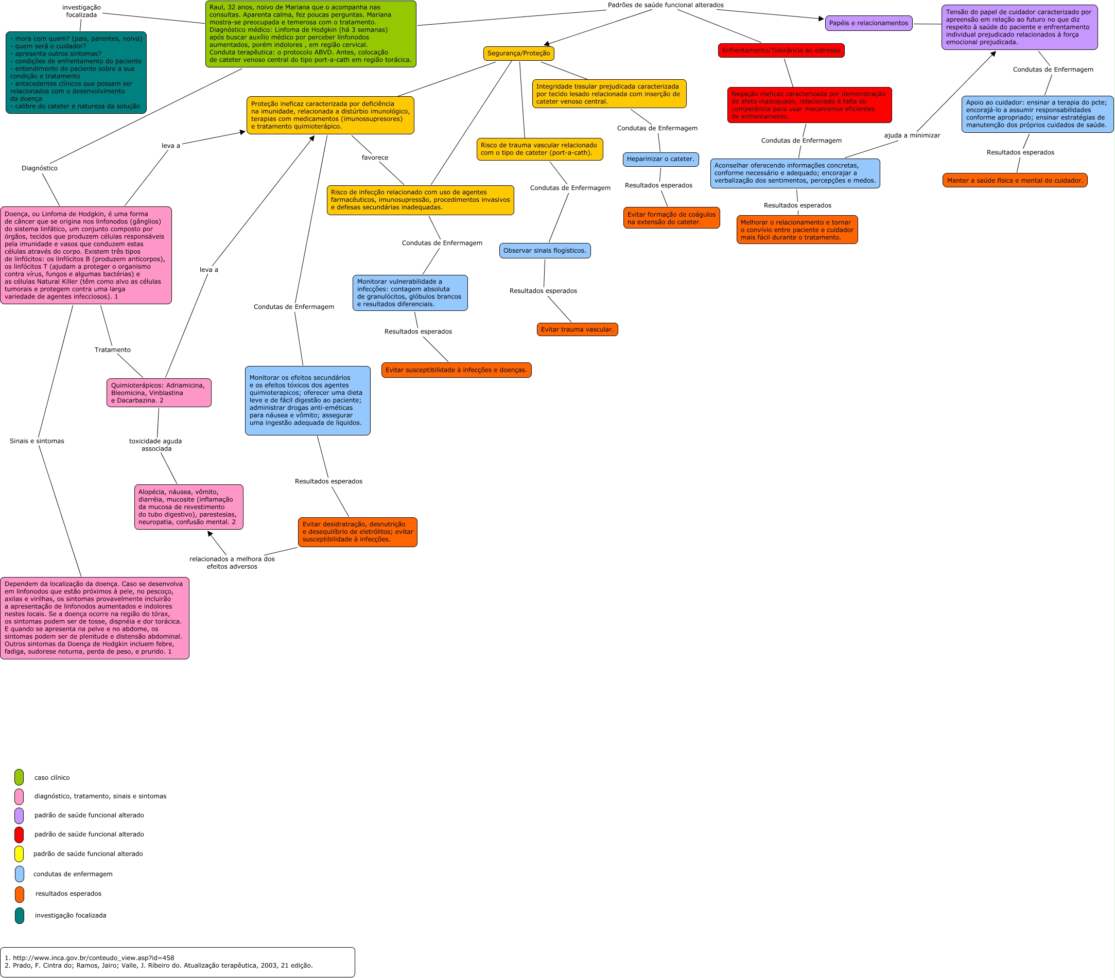 Esse mapa conceitual, produzido no IHMC CmapTools, tem a informação relacionada a: linfoma_jade, Monitorar vulnerabilidade a infecções: contagem absoluta de granulócitos, glóbulos brancos e resultados diferenciais. Resultados esperados Evitar susceptibilidade à infecções e doenças., Proteção ineficaz caracterizada por deficiência na imunidade, relacionada a distúrbio imunológico, terapias com medicamentos (imunossupresores) e tratamento quimioterápico. Condutas de Enfermagem Monitorar os efeitos secundários e os efeitos tóxicos dos agentes quimioterapicos; oferecer uma dieta leve e de fácil digestão ao paciente; administrar drogas anti-eméticas para náusea e vômito; assegurar uma ingestão adequada de liquidos., Monitorar os efeitos secundários e os efeitos tóxicos dos agentes quimioterapicos; oferecer uma dieta leve e de fácil digestão ao paciente; administrar drogas anti-eméticas para náusea e vômito; assegurar uma ingestão adequada de liquidos. Resultados esperados Evitar desidratração, desnutrição e desequilíbrio de eletrólitos; evitar susceptibilidade à infecções., Raul, 32 anos, noivo de Mariana que o acompanha nas consultas. Aparenta calma, fez poucas perguntas. Mariana mostra-se preocupada e temerosa com o tratamento. Diagnóstico médico: Linfoma de Hodgkin (há 3 semanas) após buscar auxílio médico por perceber linfonodos aumentados, porém indolores , em região cervical. Conduta terapêutica: o protocolo ABVD. Antes, colocação de cateter venoso central do tipo port-a-cath em região torácica. investigação focalizada - mora com quem? (pais, parentes, noiva) - quem será o cuidador? - apresenta outros sintomas? - condições de enfrentamento do paciente - entendimento do paciente sobre a sua condição e tratamento - antecedentes clínicos que possam ser relacionados com o desenvolvimento da doença - calibre do cateter e natureza da solução, Heparinizar o cateter. Resultados esperados Evitar formação de coágulos na extensão do cateter., Doença, ou Linfoma de Hodgkin, é uma forma de câncer que se origina nos linfonodos (gânglios) do sistema linfático, um conjunto composto por órgãos, tecidos que produzem células responsáveis pela imunidade e vasos que conduzem estas células através do corpo. Existem três tipos de linfócitos: os linfócitos B (produzem anticorpos), os linfócitos T (ajudam a proteger o organismo contra vírus, fungos e algumas bactérias) e as células Natural Killer (têm como alvo as células tumorais e protegem contra uma larga variedade de agentes infecciosos). 1 leva a Proteção ineficaz caracterizada por deficiência na imunidade, relacionada a distúrbio imunológico, terapias com medicamentos (imunossupresores) e tratamento quimioterápico., Integridade tissular prejudicada caracterizada por tecido lesado relacionada com inserção de cateter venoso central. Condutas de Enfermagem Heparinizar o cateter., Tensão do papel de cuidador caracterizado por apreensão em relação ao futuro no que diz respeito à saúde do paciente e enfrentamento individual prejudicado relacionados à força emocional prejudicada. Condutas de Enfermagem Apoio ao cuidador: ensinar a terapia do pcte; encorajá-lo a assumir responsabilidades conforme apropriado; ensinar estratégias de manutenção dos próprios cuidados de saúde., Quimioterápicos: Adriamicina, Bleomicina, Vinblastina e Dacarbazina. 2 toxicidade aguda associada Alopécia, náusea, vômito, diarréia, mucosite (inflamação da mucosa de revestimento do tubo digestivo), parestesias, neuropatia, confusão mental. 2, Enfrentamento/Tolerância ao estresse ???? Negação ineficaz caracterizada por demonstração de afeto inadequado, relacionado à falta de competência para usar mecanismos eficientes de enfrentamento., Segurança/Proteção ???? Risco de infecção relacionado com uso de agentes farmacêuticos, imunosupressão, procedimentos invasivos e defesas secundárias inadequadas., Proteção ineficaz caracterizada por deficiência na imunidade, relacionada a distúrbio imunológico, terapias com medicamentos (imunossupresores) e tratamento quimioterápico. favorece Risco de infecção relacionado com uso de agentes farmacêuticos, imunosupressão, procedimentos invasivos e defesas secundárias inadequadas., Segurança/Proteção ???? Integridade tissular prejudicada caracterizada por tecido lesado relacionada com inserção de cateter venoso central., Doença, ou Linfoma de Hodgkin, é uma forma de câncer que se origina nos linfonodos (gânglios) do sistema linfático, um conjunto composto por órgãos, tecidos que produzem células responsáveis pela imunidade e vasos que conduzem estas células através do corpo. Existem três tipos de linfócitos: os linfócitos B (produzem anticorpos), os linfócitos T (ajudam a proteger o organismo contra vírus, fungos e algumas bactérias) e as células Natural Killer (têm como alvo as células tumorais e protegem contra uma larga variedade de agentes infecciosos). 1 Sinais e sintomas Dependem da localização da doença. Caso se desenvolva em linfonodos que estão próximos à pele, no pescoço, axilas e virilhas, os sintomas provavelmente incluirão a apresentação de linfonodos aumentados e indolores nestes locais. Se a doença ocorre na região do tórax, os sintomas podem ser de tosse, dispnéia e dor torácica. E quando se apresenta na pelve e no abdome, os sintomas podem ser de plenitude e distensão abdominal. Outros sintomas da Doença de Hodgkin incluem febre, fadiga, sudorese noturna, perda de peso, e prurido. 1, Observar sinais flogísticos. Resultados esperados Evitar trauma vascular., Risco de infecção relacionado com uso de agentes farmacêuticos, imunosupressão, procedimentos invasivos e defesas secundárias inadequadas. Condutas de Enfermagem Monitorar vulnerabilidade a infecções: contagem absoluta de granulócitos, glóbulos brancos e resultados diferenciais., Aconselhar oferec