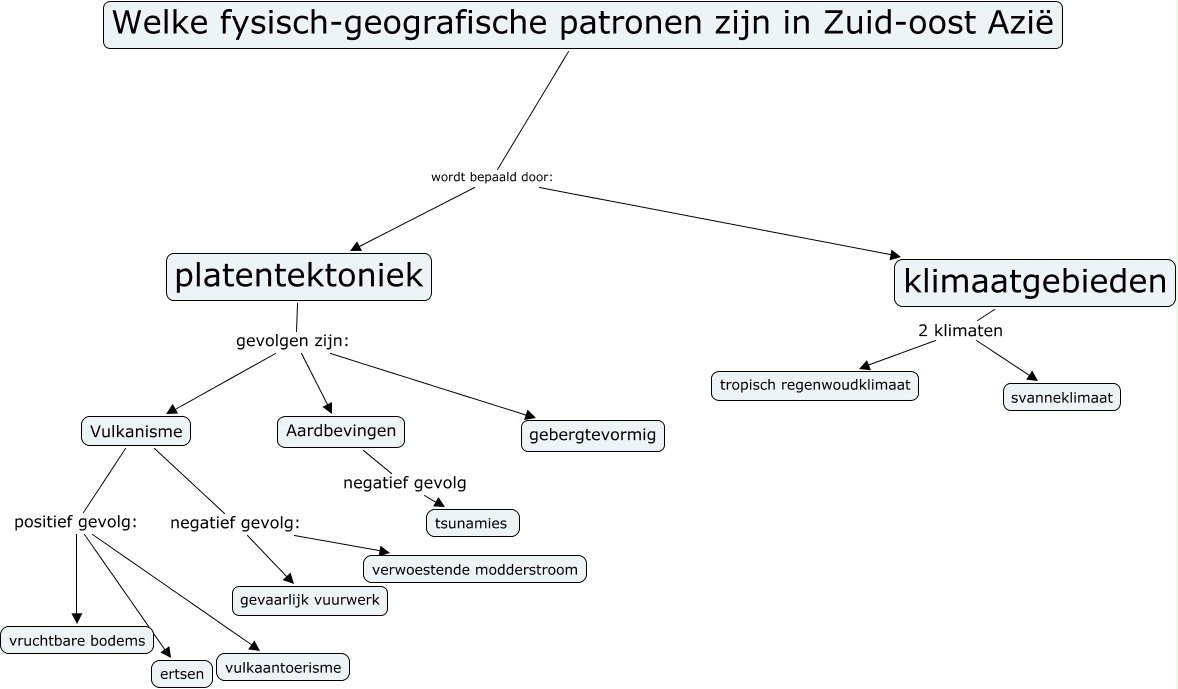 Deze Concept Map heeft informatie gerelateerd aan: paragraaf 3, platentektoniek gevolgen zijn: Vulkanisme, Vulkanisme positief gevolg: vruchtbare bodems, Vulkanisme positief gevolg: ertsen, Welke fysisch-geografische patronen zijn in Zuid-oost Azië wordt bepaald door: klimaatgebieden, Welke fysisch-geografische patronen zijn in Zuid-oost Azië wordt bepaald door: platentektoniek, platentektoniek gevolgen zijn: Aardbevingen, klimaatgebieden 2 klimaten tropisch regenwoudklimaat, Aardbevingen negatief gevolg tsunamies, klimaatgebieden 2 klimaten svanneklimaat, Vulkanisme negatief gevolg: verwoestende modderstroom, platentektoniek gevolgen zijn: gebergtevormig, Vulkanisme negatief gevolg: gevaarlijk vuurwerk, Vulkanisme positief gevolg: vulkaantoerisme