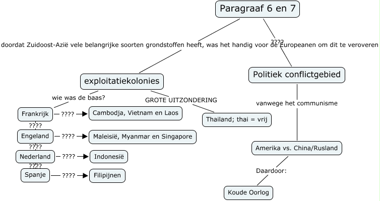 Deze Concept Map heeft informatie gerelateerd aan: Hoofdstuk 3_Paragraaf 6 en 7, exploitatiekolonies GROTE UITZONDERING Thailand; thai = vrij, exploitatiekolonies wie was de baas? Frankrijk, Nederland ???? Indonesië, Paragraaf 6 en 7 ???? Politiek conflictgebied, Engeland ???? Maleisië, Myanmar en Singapore, Frankrijk ???? Engeland, Frankrijk ???? Cambodja, Vietnam en Laos, Paragraaf 6 en 7 doordat Zuidoost-Azië vele belangrijke soorten grondstoffen heeft, was het handig voor de Europeanen om dit te veroveren exploitatiekolonies, Politiek conflictgebied vanwege het communisme Amerika vs. China/Rusland, Engeland ???? Nederland, Spanje ???? Filipijnen, Amerika vs. China/Rusland Daardoor: Koude Oorlog, Nederland ???? Spanje