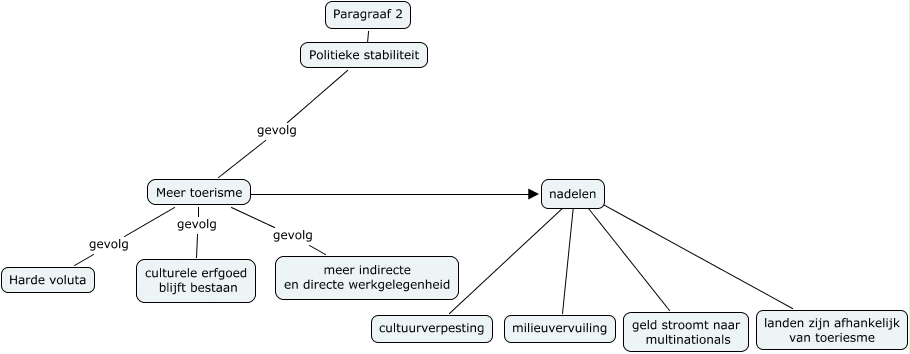 Deze Concept Map heeft informatie gerelateerd aan: paragraaf 2, Meer toerisme gevolg meer indirecte en directe werkgelegenheid, nadelen ???? landen zijn afhankelijk van toeriesme, Paragraaf 2 ???? Politieke stabiliteit, nadelen ???? geld stroomt naar multinationals, Meer toerisme ???? nadelen, Meer toerisme gevolg culturele erfgoed blijft bestaan, Meer toerisme gevolg Harde voluta, nadelen ???? cultuurverpesting, nadelen ???? milieuvervuiling, Politieke stabiliteit gevolg Meer toerisme