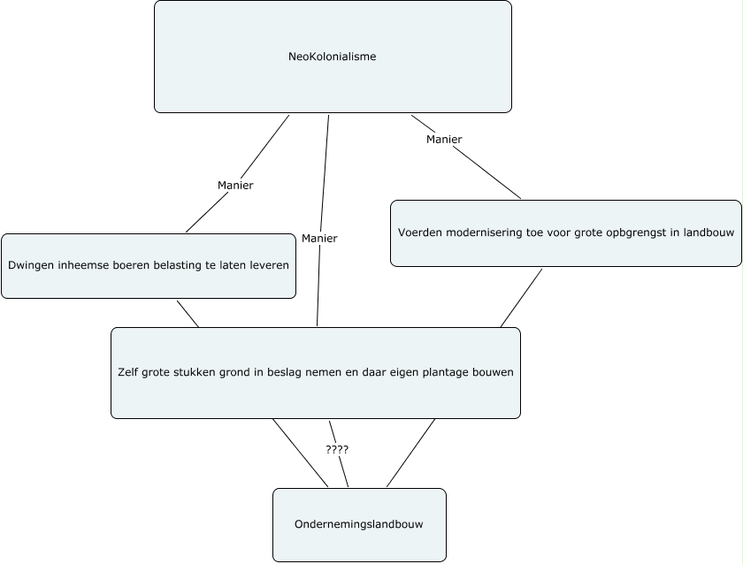 Deze Concept Map heeft informatie gerelateerd aan: neo kolonialisme, Zelf grote stukken grond in beslag nemen en daar eigen plantage bouwen ???? Ondernemingslandbouw, NeoKolonialisme Manier Voerden modernisering toe voor grote opbgrengst in landbouw, NeoKolonialisme Manier Zelf grote stukken grond in beslag nemen en daar eigen plantage bouwen, NeoKolonialisme Manier Dwingen inheemse boeren belasting te laten leveren, Voerden modernisering toe voor grote opbgrengst in landbouw ???? Ondernemingslandbouw, Dwingen inheemse boeren belasting te laten leveren ???? Ondernemingslandbouw