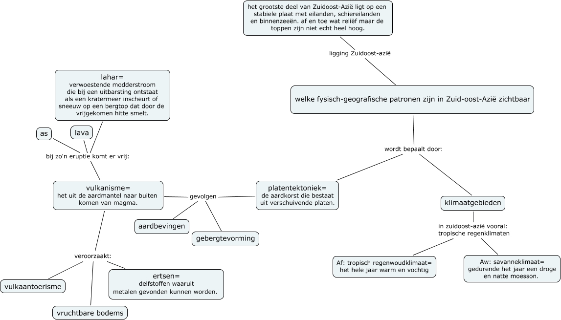Deze Concept Map heeft informatie gerelateerd aan: ak paragraaf 3, klimaatgebieden in zuidoost-azië vooral: tropische regenklimaten Aw: savanneklimaat= gedurende het jaar een droge en natte moesson., platentektoniek= de aardkorst die bestaat uit verschuivende platen. gevolgen gebergtevorming, welke fysisch-geografische patronen zijn in Zuid-oost-Azië zichtbaar wordt bepaalt door: platentektoniek= de aardkorst die bestaat uit verschuivende platen., klimaatgebieden in zuidoost-azië vooral: tropische regenklimaten Af: tropisch regenwoudklimaat= het hele jaar warm en vochtig, vulkanisme= het uit de aardmantel naar buiten komen van magma. gevolgen gebergtevorming, vulkanisme= het uit de aardmantel naar buiten komen van magma. veroorzaakt: vulkaantoerisme, vulkanisme= het uit de aardmantel naar buiten komen van magma. veroorzaakt: ertsen= delfstoffen waaruit metalen gevonden kunnen worden., welke fysisch-geografische patronen zijn in Zuid-oost-Azië zichtbaar wordt bepaalt door: klimaatgebieden, platentektoniek= de aardkorst die bestaat uit verschuivende platen. gevolgen aardbevingen, vulkanisme= het uit de aardmantel naar buiten komen van magma. gevolgen aardbevingen, vulkanisme= het uit de aardmantel naar buiten komen van magma. veroorzaakt: vruchtbare bodems