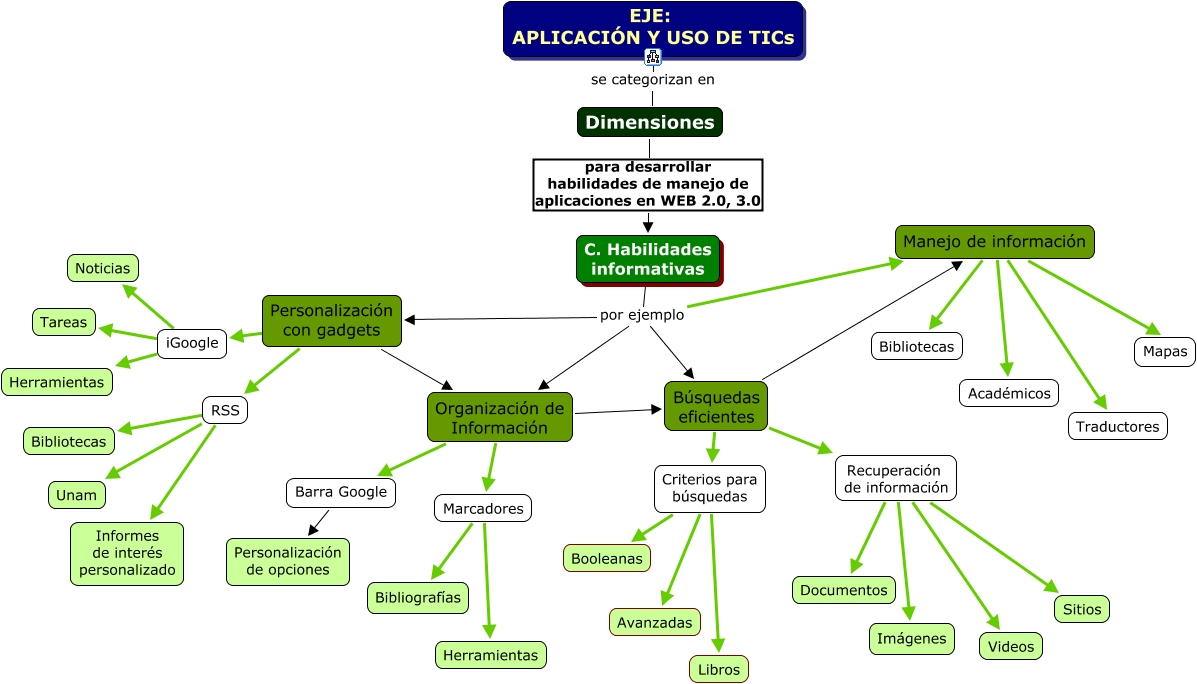 Este Cmap, tiene información relacionada con: tics_D_informativas_ycc, C. Habilidades informativas por ejemplo Búsquedas eficientes, Marcadores Herramientas, Recuperación de información Imágenes, Recuperación de información Videos, Manejo de información Bibliotecas, Criterios para búsquedas Avanzadas, Barra Google Personalización de opciones, Marcadores Bibliografías, Personalización con gadgets iGoogle, Organización de Información Barra Google, EJE: APLICACIÓN Y USO DE TICs se categorizan en Dimensiones, Criterios para búsquedas Booleanas, RSS Unam, Manejo de información Mapas, Organización de Información Marcadores, Personalización con gadgets RSS, Manejo de información Traductores, Criterios para búsquedas Libros, Recuperación de información Documentos, C. Habilidades informativas por ejemplo Manejo de información