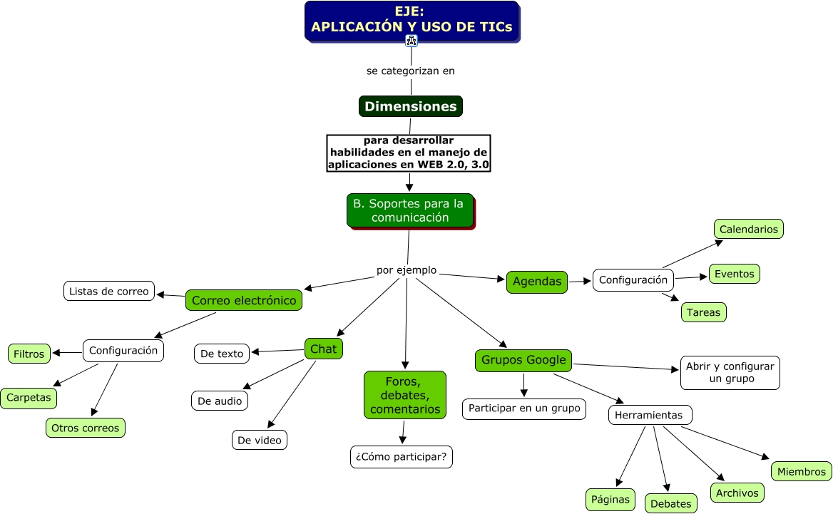 Este Cmap, tiene información relacionada con: tics_B_comunicacion_ycc, Configuración Tareas, Chat De audio, Configuración Filtros, Agendas Configuración, Configuración Otros correos, Herramientas Archivos, Configuración Eventos, B. Soportes para la comunicación por ejemplo Agendas, Correo electrónico Listas de correo, EJE: APLICACIÓN Y USO DE TICs se categorizan en Dimensiones, Chat De video, B. Soportes para la comunicación por ejemplo Chat, Herramientas Miembros, B. Soportes para la comunicación por ejemplo Grupos Google, Correo electrónico Configuración, Configuración Calendarios, B. Soportes para la comunicación por ejemplo Foros, debates, comentarios, Chat De texto, Grupos Google Herramientas, Grupos Google Participar en un grupo