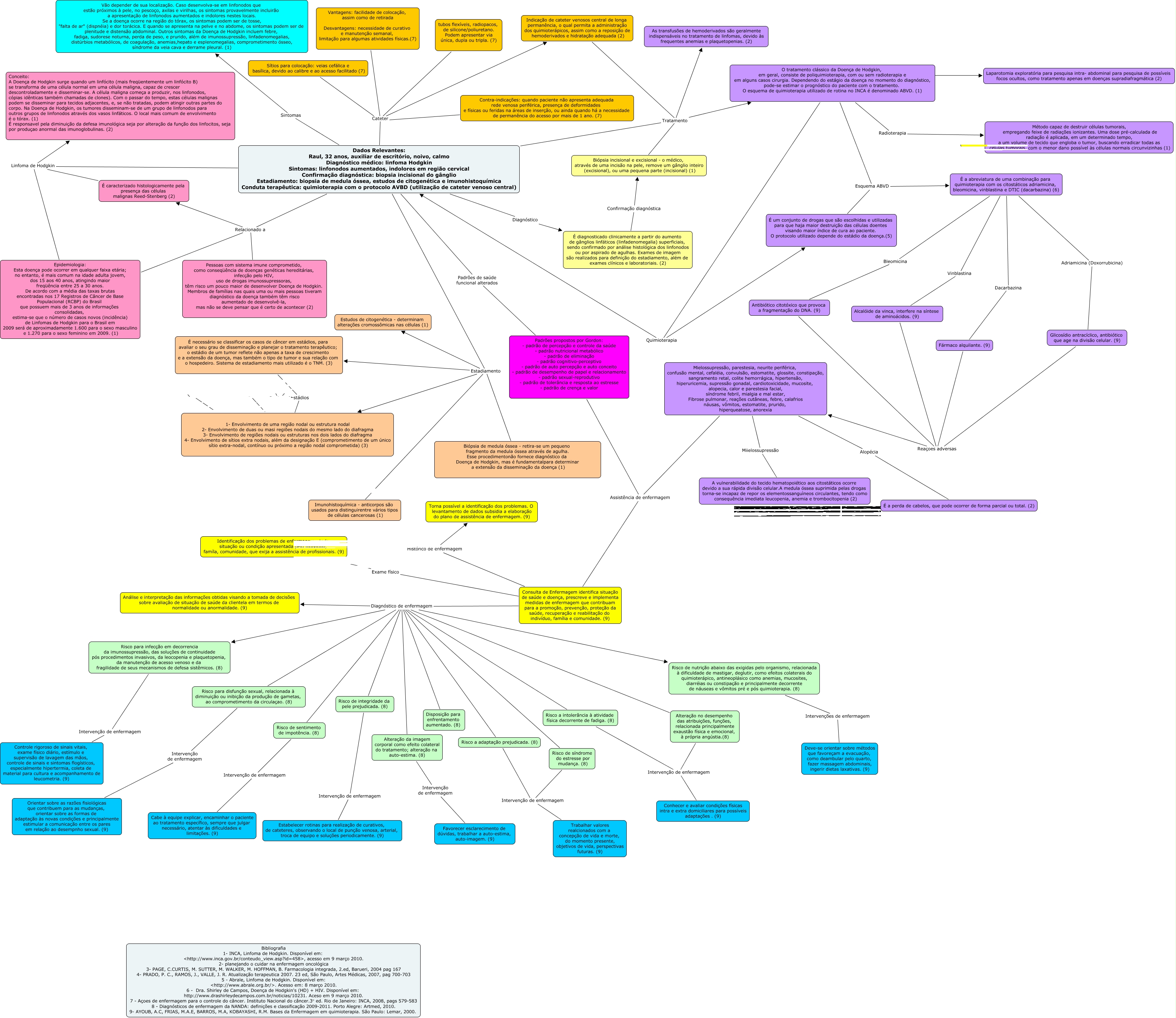 This Concept Map, created with IHMC CmapTools, has information related to: Dispnéia e cianose @, Biópsia incisional e excisional - o médico, através de uma incisão na pele, remove um gânglio inteiro (excisional), ou uma pequena parte (incisional) (1) Tratamento O tratamento clássico da Doença de Hodgkin, em geral, consiste de poliquimioterapia, com ou sem radioterapia e em alguns casos cirurgia. Dependendo do estágio da doença no momento do diagnóstico, pode-se estimar o prognóstico do paciente com o tratamento. O esquema de quimioterapia utilizado de rotina no INCA é denominado ABVD. (1), Mielossupressão, parestesia, neurite periférica, confusão mental, cefaléia, convulsão, estomatite, glossite, constipação, sangramento retal, colite hemorrágica, hipertensão, hiperuricemia, supressão gonadal, cardiotoxicidade, mucosite, alopecia, calor e parestesia facial, síndrome febril, mialgia e mal estar, Fibrose pulmonar, reações cutâneas, febre, calafrios náusas, vômitos, estomatite, prurido, hiperqueatose, anorexia Miielossupressão A vulnerabilidade do tecido hematopoiético aos citostáticos ocorre devido a sua rápida divisão celular.A medula óssea suprimida pelas drogas torna-se incapaz de repor os elementossanguìneos circulantes, tendo como consequência imediata leucopenia, anemia e trombocitopenia (2), Consulta de Enfermagem identifica situação de saúde e doença, prescreve e implementa medidas de enfermagem que contribuam para a promoção, prevenção, proteção da saúde, recuperação e reabilitação do indivíduo, família e comunidade. (9) Diagnóstico de enfermagem Risco de nutrição abaixo das exigidas pelo organismo, relacionada à dificuldade de mastigar, deglutir, como efeitos colaterais do quimioterápico, antineoplásico como anemias, mucosites, diarréias ou constipação e principalmente decorrente de náuseas e vômitos pré e pós quimioterapia. (8), O tratamento clássico da Doença de Hodgkin, em geral, consiste de poliquimioterapia, com ou sem radioterapia e em alguns casos cirurgia. Dependendo do estágio da doença no momento do diagnóstico, pode-se estimar o prognóstico do paciente com o tratamento. O esquema de quimioterapia utilizado de rotina no INCA é denominado ABVD. (1) Radioterapia Método capaz de destruir células tumorais, empregando feixe de radiações ionizantes. Uma dose pré-calculada de radiação é aplicada, em um determinado tempo, a um volume de tecido que engloba o tumor, buscando erradicar todas as células tumorais, com o menor dano possível às células normais circunvizinhas (1), Sítios para colocação: veias cefálica e basílica, devido ao calibre e ao acesso facilitado (7) Cateter Indicação de cateter venosos central de longa permanência, o qual permita a administração dos quimioterápicos, assim como a reposição de hemoderivados e hidratação adequada (2), Risco a intolerância à atividade física decorrente de fadiga. (8) Intervenção de enfermagem Conhecer e avaliar condições físicas intra e extra domiciliares para possíveis adaptações . (9), Indicação de cateter venosos central de longa permanência, o qual permita a administração dos quimioterápicos, assim como a reposição de hemoderivados e hidratação adequada (2) Tratamento As transfusões de hemoderivados são geralmente indispensáveis no tratamento de linfomas, devido às frequentes anemias e plaquetopenias. (2), Dados Relevantes: Raul, 32 anos, auxiliar de escritório, noivo, calmo Diagnóstico médico: linfoma Hodgkin Sintomas: linfonodos aumentados, indolores em região cervical Confirmação diagnóstica: biopsia incisional do gânglio Estadiamento: biopsia de medula óssea, estudos de citogenética e imunohistoquímica Conduta terapêutica: quimioterapia com o protocolo AVBD (utilização de cateter venoso central) Sintomas Vão depender de sua localização. Caso desenvolva-se em linfonodos que estão próximos à pele, no pescoço, axilas e virilhas, os sintomas provavelmente incluirão a apresentação de linfonodos aumentados e indolores nestes locais. Se a doença ocorre na região do tórax, os sintomas podem ser de tosse, "falta de ar" (dispnéia) e dor torácica. E quando se apresenta na pelve e no abdome, os sintomas podem ser de plenitude e distensão abdominal. Outros sintomas da Doença de Hodgkin incluem febre, fadiga, sudorese noturna, perda de peso, e prurido, além de imunossupressão, linfadenomegalias, distúrbios metabólicos, de coagulação, anemias,hepato e esplenomegalias, comprometimento ósseo, síndrome da veia cava e derrame pleural. (1), Dados Relevantes: Raul, 32 anos, auxiliar de escritório, noivo, calmo Diagnóstico médico: linfoma Hodgkin Sintomas: linfonodos aumentados, indolores em região cervical Confirmação diagnóstica: biopsia incisional do gânglio Estadiamento: biopsia de medula óssea, estudos de citogenética e imunohistoquímica Conduta terapêutica: quimioterapia com o protocolo AVBD (utilização de cateter venoso central) Tratamento As transfusões de hemoderivados são geralmente indispensáveis no tratamento de linfomas, devido às frequentes anemias e plaquetopenias. (2), Consulta de Enfermagem identifica situação de saúde e doença, prescreve e implementa medidas de enfermagem que contribuam para a promoção, prevenção, proteção da saúde, recuperação e reabilitação do indivíduo, família e comunidade. (9) Diagnóstico de enfermagem Disposição para enfrentamento aumentado. (8), O tratamento clássico da Doença de Hodgkin, em geral, consiste de poliquimioterapia, com ou sem radioterapia e em alguns casos cirurgia. Dependendo do estágio da doença no momento do diagnóstico, pode-se estimar o prognóstico do paciente com o tratamento. O esquema de quimioterapia utilizado de rotina no INCA é denominado ABVD. (1) Quimioterapia É um conjunto de drogas que são escolhidas e utilizadas para que haja maior destruição das células doentes v