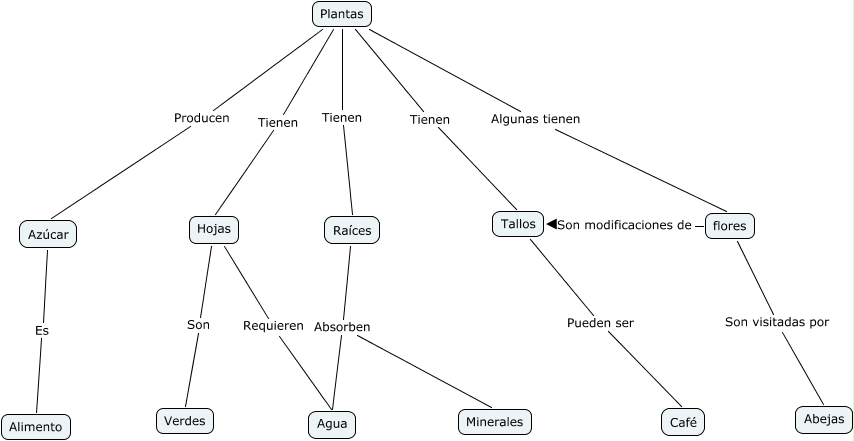 Este Cmap, tiene información relacionada con: Las plantas, Plantas Tienen Tallos, Raíces Absorben Minerales, flores Son modificaciones de Tallos, Plantas Algunas tienen flores, Hojas Requieren Agua, Plantas Tienen Hojas, Raíces Absorben Agua, Plantas Tienen Raíces, Hojas Son Verdes, flores Son visitadas por Abejas, Plantas Producen Azúcar, Tallos Pueden ser Café, Azúcar Es Alimento