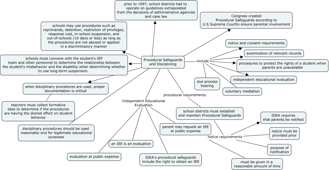This Concept Map, created with IHMC CmapTools, has information related to: Procedural Safeguards and Disciplining, Procedural Safeguards and Disciplining ???? disciplinary procedures should be used reasonably and for legitimate educational purposes, Procedural Safeguards and Disciplining Independent Educational Evaluation IDEA's procedural safeguards include the right to obtain an IEE, Procedural Safeguards and Disciplining include examination of relevant records, when disciplinary procedures are used, proper documentation is critical ???? teachers must collect formative data to determine if the procedures are having the disired effect on student behavior, Procedural Safeguards and Disciplining include notice and consent requirements, Procedural Safeguards and Disciplining ???? prior to 1997, school districts had to operate on guidelines extrapolated from the decisions of administrative agencies and case law, Procedural Safeguards and Disciplining include due process hearing, Procedural Safeguards and Disciplining include voluntary mediation, Procedural Safeguards and Disciplining Independent Educational Evaluation an IEE is an evaluation, Procedural Safeguards and Disciplining Independent Educational Evaluation evaluation at public expense, purpose of notification notice requirements IDEA requires that parents be notified, Procedural Safeguards and Disciplining procedural requirements school districts must establish and maintain Procedural Safeguards, Procedural Safeguards and Disciplining ???? schools must convene with the student's IEP team and other personnel to determine the relationship between the student's misbehavior and the disability when determining whether to use long-term suspension., notice must be provided prior notice requirements IDEA requires that parents be notified, Procedural Safeguards and Disciplining ???? when disciplinary procedures are used, proper documentation is critical, Procedural Safeguards and Disciplining include procedures to protect the rights of a student when parents are unavailable, Procedural Safeguards and Disciplining Independent Educational Evaluation parent may request an IEE at public expense, Procedural Safeguards and Disciplining include independent educational evaluation, must be given in a reasonable amount of time notice requirements IDEA requires that parents be notified, school districts must establish and maintain Procedural Safeguards notice requirements IDEA requires that parents be notified