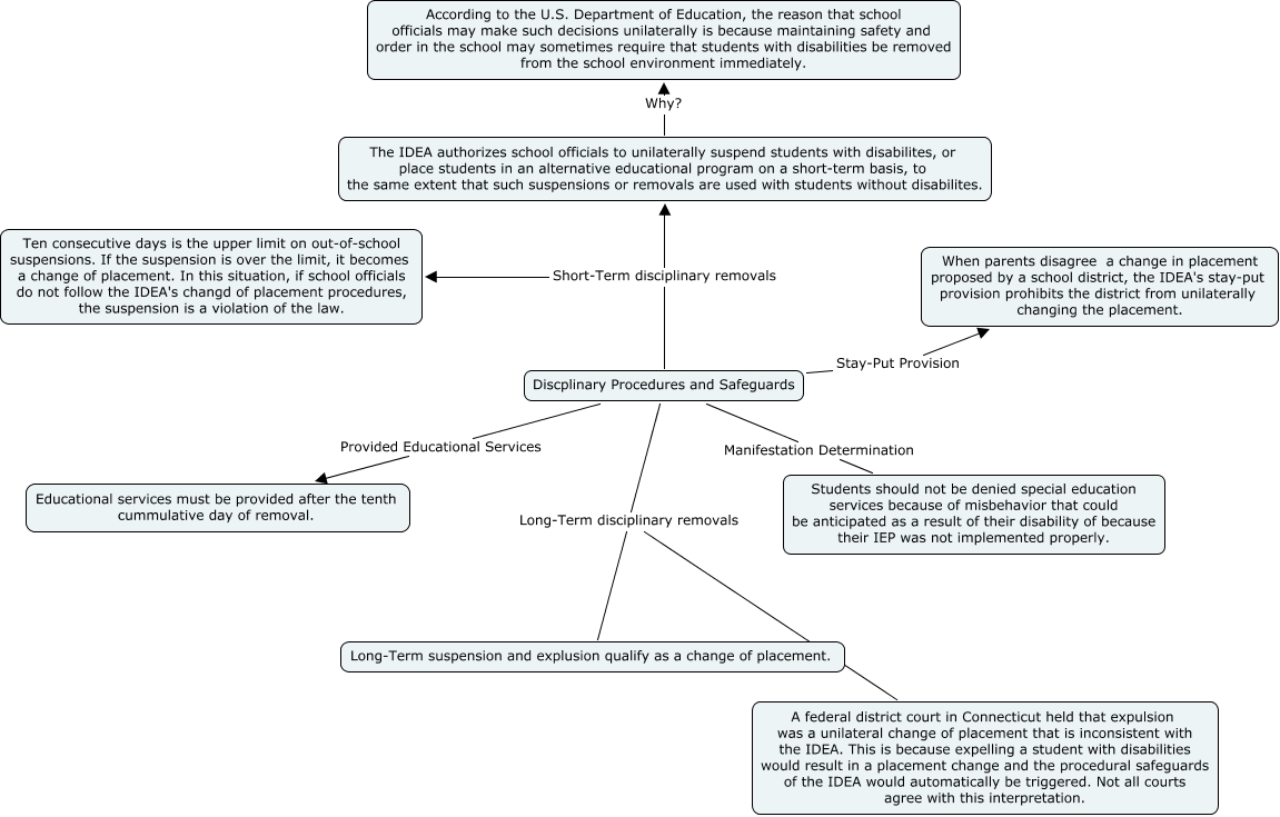 This Concept Map, created with IHMC CmapTools, has information related to: Disciplinary Procedures and Safegaurds, Discplinary Procedures and Safeguards Manifestation Determination Students should not be denied special education services because of misbehavior that could be anticipated as a result of their disability of because their IEP was not implemented properly., Discplinary Procedures and Safeguards Long-Term disciplinary removals Long-Term suspension and explusion qualify as a change of placement., The IDEA authorizes school officials to unilaterally suspend students with disabilites, or place students in an alternative educational program on a short-term basis, to the same extent that such suspensions or removals are used with students without disabilites. Why? According to the U.S. Department of Education, the reason that school officials may make such decisions unilaterally is because maintaining safety and order in the school may sometimes require that students with disabilities be removed from the school environment immediately., Discplinary Procedures and Safeguards Short-Term disciplinary removals Ten consecutive days is the upper limit on out-of-school suspensions. If the suspension is over the limit, it becomes a change of placement. In this situation, if school officials do not follow the IDEA's changd of placement procedures, the suspension is a violation of the law., Discplinary Procedures and Safeguards Stay-Put Provision When parents disagree a change in placement proposed by a school district, the IDEA's stay-put provision prohibits the district from unilaterally changing the placement., Discplinary Procedures and Safeguards Short-Term disciplinary removals The IDEA authorizes school officials to unilaterally suspend students with disabilites, or place students in an alternative educational program on a short-term basis, to the same extent that such suspensions or removals are used with students without disabilites., Discplinary Procedures and Safeguards Long-Term disciplinary removals A federal district court in Connecticut held that expulsion was a unilateral change of placement that is inconsistent with the IDEA. This is because expelling a student with disabilities would result in a placement change and the procedural safeguards of the IDEA would automatically be triggered. Not all courts agree with this interpretation., Discplinary Procedures and Safeguards Provided Educational Services Educational services must be provided after the tenth cummulative day of removal.
