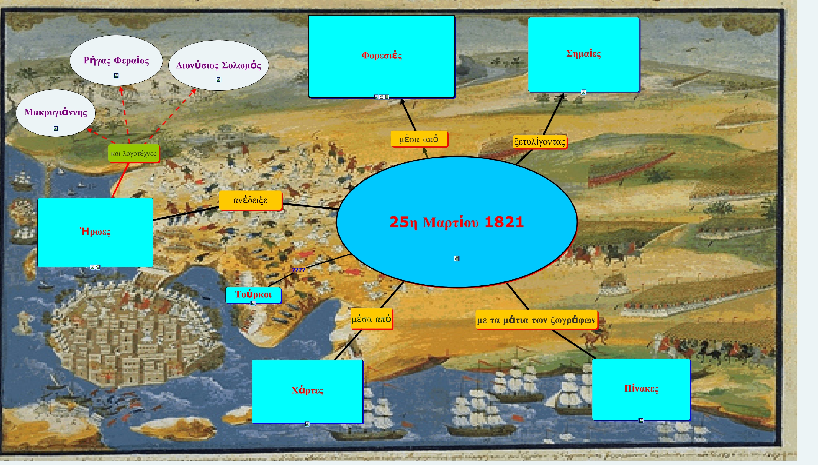 This Concept Map, created with IHMC CmapTools, has information related to: 25η Μαρτίου 1821, 25η Μαρτίου 1821 ανέδειξε Ήρωες, 25η Μαρτίου 1821 μέσα από Φορεσιές, Ήρωες ???? Διονύσιος Σολωμός, 25η Μαρτίου 1821 ξετυλίγοντας Σημαίες, 25η Μαρτίου 1821 μέσα από Χάρτες, 25η Μαρτίου 1821 με τα μάτια των ζωγράφων Πίνακες, Ήρωες ???? Ρήγας Φεραίος, 25η Μαρτίου 1821 ???? Τούρκοι, Ήρωες και λογοτέχνες Μακρυγιάννης