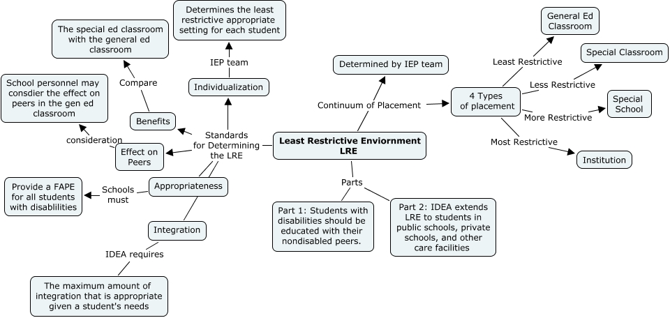 This Concept Map, created with IHMC CmapTools, has information related to: LRE, 4 Types of placement More Restrictive Special School, Least Restrictive Enviornment LRE Continuum of Placement Determined by IEP team, Least Restrictive Enviornment LRE Standards for Determining the LRE Benefits, Integration IDEA requires The maximum amount of integration that is appropriate given a student's needs, Least Restrictive Enviornment LRE Standards for Determining the LRE Effect on Peers, Least Restrictive Enviornment LRE Parts Part 2: IDEA extends LRE to students in public schools, private schools, and other care facilities, Least Restrictive Enviornment LRE Standards for Determining the LRE Appropriateness, Individualization IEP team Determines the least restrictive appropriate setting for each student, Appropriateness Schools must Provide a FAPE for all students with disablilities, Least Restrictive Enviornment LRE Standards for Determining the LRE Individualization, Least Restrictive Enviornment LRE Continuum of Placement 4 Types of placement, 4 Types of placement Less Restrictive Special Classroom, Least Restrictive Enviornment LRE Parts Part 1: Students with disabilities should be educated with their nondisabled peers., 4 Types of placement Least Restrictive General Ed Classroom, 4 Types of placement Most Restrictive Institution, Least Restrictive Enviornment LRE Standards for Determining the LRE Integration, Benefits Compare The special ed classroom with the general ed classroom, Effect on Peers consideration School personnel may consdier the effect on peers in the gen ed classroom