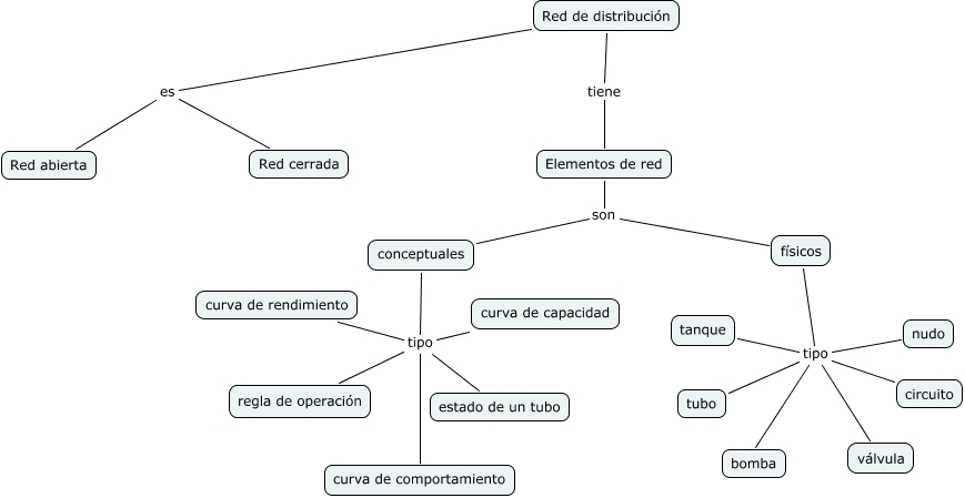 Este Cmap, tiene información relacionada con: Red de distribución, Red de distribución es Red abierta, Red de distribución tiene Elementos de red, físicos tipo bomba, conceptuales tipo curva de rendimiento, Red de distribución es Red cerrada, físicos tipo válvula, Elementos de red son conceptuales, conceptuales tipo estado de un tubo, físicos tipo circuito, físicos tipo tubo, Elementos de red son físicos, físicos tipo nudo, físicos tipo tanque, conceptuales tipo regla de operación, conceptuales tipo curva de comportamiento, conceptuales tipo curva de capacidad